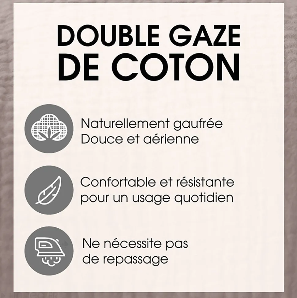 Matière double face : Une face en double gaze de coton 140 g/m² pour une douceur gaufrée, l’autre en coton 57 fils/cm² offrant confort et respirabilité.
