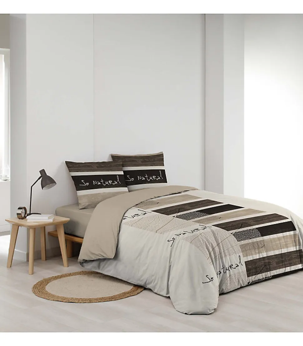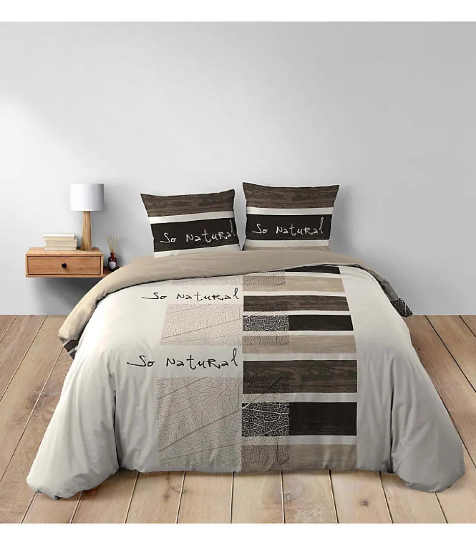 Offrez à votre chambre une ambiance douce et naturelle avec la parure de lit So Natural. Cette housse de couette en coton au tissage 42 fils/cm² allie confort et résistance pour des nuits paisibles. Son design moderne aux imprimés graphiques et aux tons naturels apporte une touche élégante et chaleureuse à votre décoration intérieure.• Dimensions housse : 240 x 220 cm (lit 2 personnes)• Dimensions taies : 63 x 63 cm (x2)• Matière : 100% coton – 42 fils/cm²• Finition : fermeture boutons pressions• Motif : imprimé So Natural, tons beige, taupe et brun• Entretien : lavable en machine à 40°C