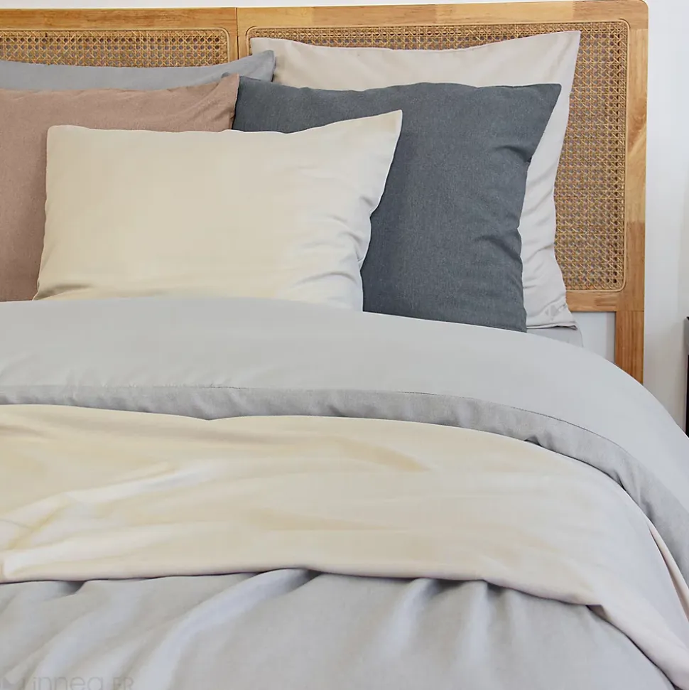 Parure de lit 260×240 cm SENSATION FLANELLE microfibre bi-matière inspiration flanelle beige Crème motif chinéDécouvrez la collection SENSATION FLANELLE, conçue pour vous envelopper de douceur et de chaleur tout au long de la saison hivernale. Inspirée de la flanelle de coton, cette parure de lit allie confort et style avec son élégant motif chiné, apportant une touche raffinée à votre chambre. Son design bi-matière offre un véritable cocon de bien-être. D’un côté, une face en flanelle microfibre 115 g/m2 qui procure une chaleur douce et réconfortante, idéale pour les nuits fraîches. De l’autre, une face en microfibre légère de 83 g/m2, pour un équilibre parfait entre chaleur et respirabilité. Cette association harmonieuse de matières garantit des nuits sereines et apaisantes, peu importe la température extérieure. Pratique et fonctionnelle, la parure Sensation Flanelle a été pensée pour vous simplifier la vie. Les housses de couette sont dotées de fentes passe-mains, facilitant ainsi l’habillage du lit, tandis que la fermeture à boutons assure un maintien impeccable de la couette. La housse de couette en 260×240 cm est parfaite pour un lit double king-size en 180×200 cm. Les taies d’oreiller au format 63×63 cm en forme de sac complètent harmonieusement cet ensemble, pour un lit à la fois élégant et confortable.Proposée en quatre teintes douces et intemporelles, la collection s’intègre parfaitement à tout type de décoration intérieure. Que vous ayez un style moderne ou plus classique, cette parure deviendra un incontournable de votre chambre cet hiver. Offrez-vous le luxe de la douceur et transformez vos nuits en moments de pur confort avec la collection Sensation Flanelle.Côté technique :Matière : bi-matière microfibre sensation flanelle 115g sur une face et microfibre 83 g/m2 sur l’autre faceGrammage : 115 g/m2 et 83 g/m2Motifs : uni chinéParure composée de 1 housse