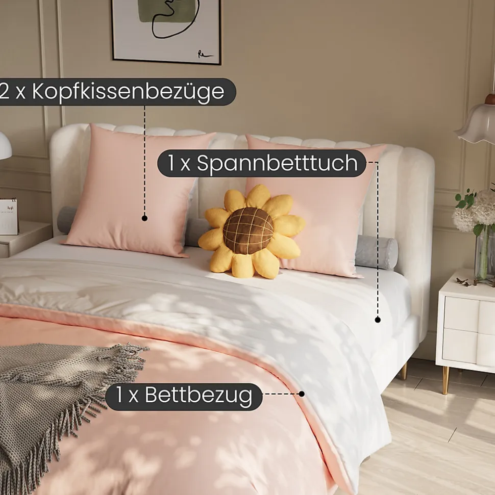 1. Il est équipé d’un drap-housse, mieux fixé qu’un drap plat et moins sujet aux plis, ce qui permet de garder le lit toujours propre et esthétique. De plus, il est accompagné d’une housse de couette utilisable toute l’année, qui peut être associée à une couette en hiver pour un confort optimal et une utilisation simplifiée pour les clients.2. La housse de couette est dotée de 4 attaches aux coins pour fixer le noyau de la couette en position, évitant tout déplacement. Cela garantit que la couette conserve toujours une forme propre et ordonnée.3. Elle est fabriquée en tissu polyester, qui offre une excellente résistance aux plis et une grande stabilité de forme. Même après une utilisation et un lavage répétés, elle conserve son bel aspect et sa texture.4. Avec notre ensemble de literie pratique, profitez d’une solution idéale pour un lit toujours propre et confortable. La combinaison de drap-housse, housse de couette et taies d’oreiller garantit une apparence soignée et esthétique à votre espace de sommeil.5. Cet ensemble est parfait pour les personnes recherchant un lit soigné et élégant sans effort. Il convient parfaitement à un usage quotidien dans la chambre et répond aux attentes de ceux qui privilégient une solution facile à entretenir.Caractéristiques du produit :Ensemble de literie pour un confort tout au long de l’annéeAttaches aux coins pour une couette bien maintenueTissu en polyester de haute qualité, résistant aux plis et durableFacile à nettoyer et à entretenirDimensions :Housse de matelas 140x200x30 cm + housse de couette 140×210 cm + taie d’oreiller 80×80 cm (x2)Matériau :Microfibre brossée 110 g/m², très douce, avec une sensation proche du cotonRespirante et régulatrice de températureEmbellissez votre chambre et profitez d’un sommeil réparateur.