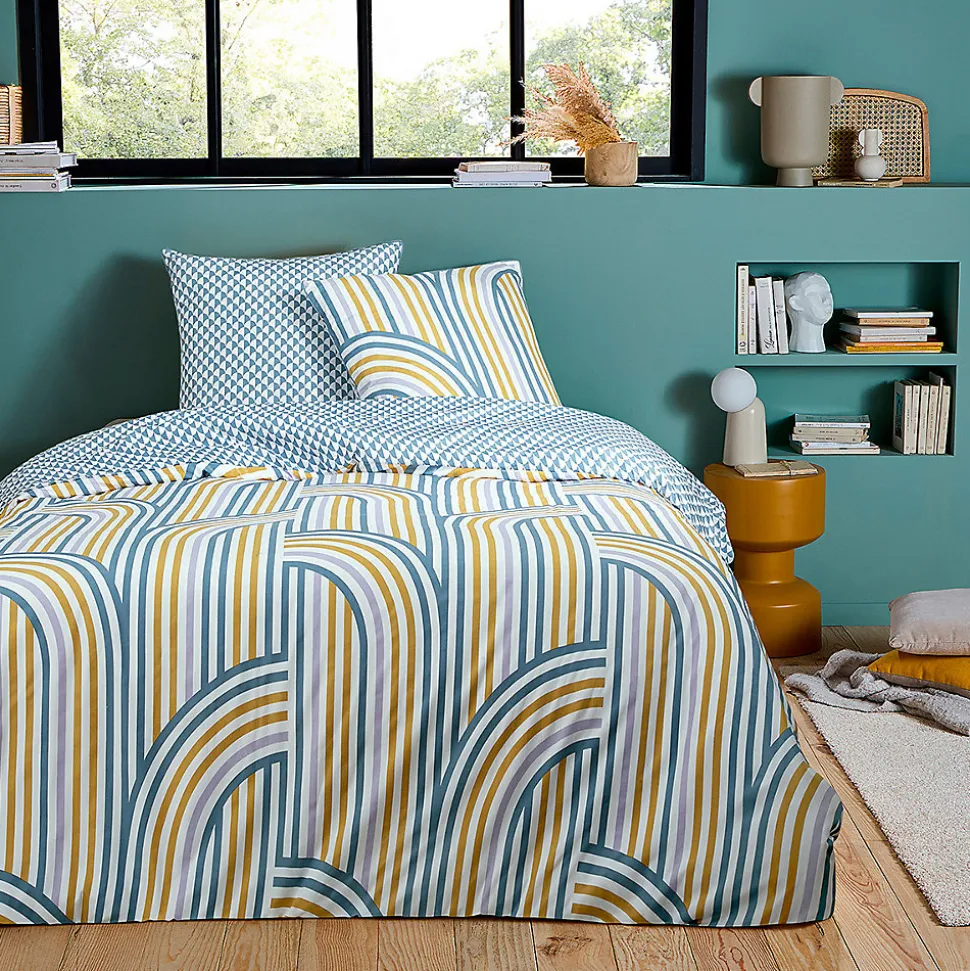 Parure de lit en microfibre réversible imprimé géométrique TANGO comprenant 1 housse de couette + 2 taies d’oreiller 63x63cmApportez une touche de modernité et de dynamisme à votre chambre avec la parure de lit Tango, conçue pour sublimer votre intérieur avec un design réversible et un imprimé géométrique audacieux dans des tons bleus et jaune. Son motif contemporain apporte du caractère à votre décoration tout en créant une atmosphère chaleureuse et élégante.Les taies d’oreiller assorties complètent l’ensemble avec harmonie, ajoutant une touche raffinée à votre lit. Conçue pour votre bien-être, la parure Tango est certifiée Oeko-Tex et lavable en machine à 30°, garantissant un entretien facile et une durabilité optimale.Nos parures Tango sont réalisées en microfibre lavée, une matière douce et soyeuse au toucher effet peau de pêche, offrant un confort incomparable.Offrez-vous le parfait équilibre entre style et confort avec Tango, une parure qui invite à la détente et à la douceur.A compléter avec nos draps housse de la collection ESSENTIEL – FUTURE HOMECOMPOSITIONS PRODUIT :Matière : 100% Polyester – Microfibre lavée – effet peau de pêcheCouleurs : MulticoloreFinition des taies : BiaisFinition de la housse de couette : boutonsCertification : OEKO-TEXLavage : à 30°C en machine2 taies d’oreiller 63x63cmEn savoir plus :Ce produit labélisé STANDARD 100 by OEKO-TEX – certificat n° 18.HPK48415 HOHENSTEIN HTTI suit un processus de fabrication certifié et contrôlé, respectueux de votre peau. Le STANDARD 100 by OEKO-TEX EST un label qui vous garantit que vos draps ne contiennent aucuns produits toxiques pour votre santé.