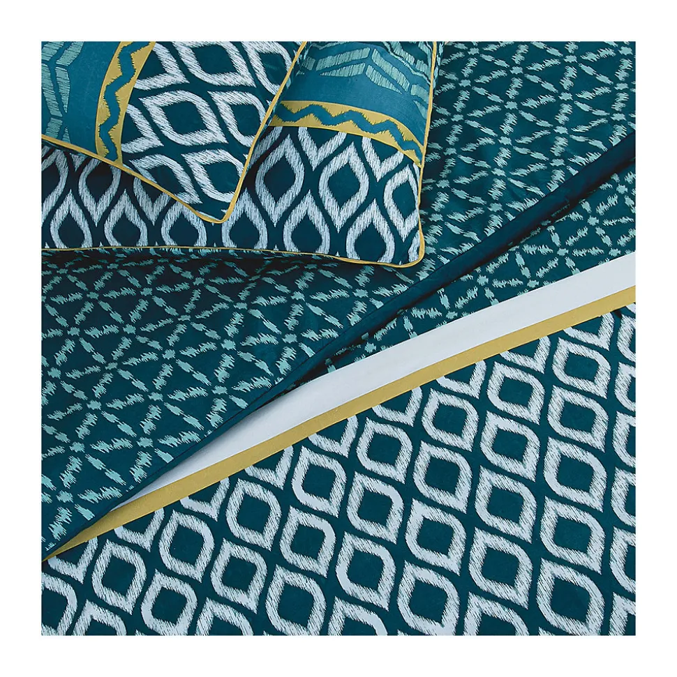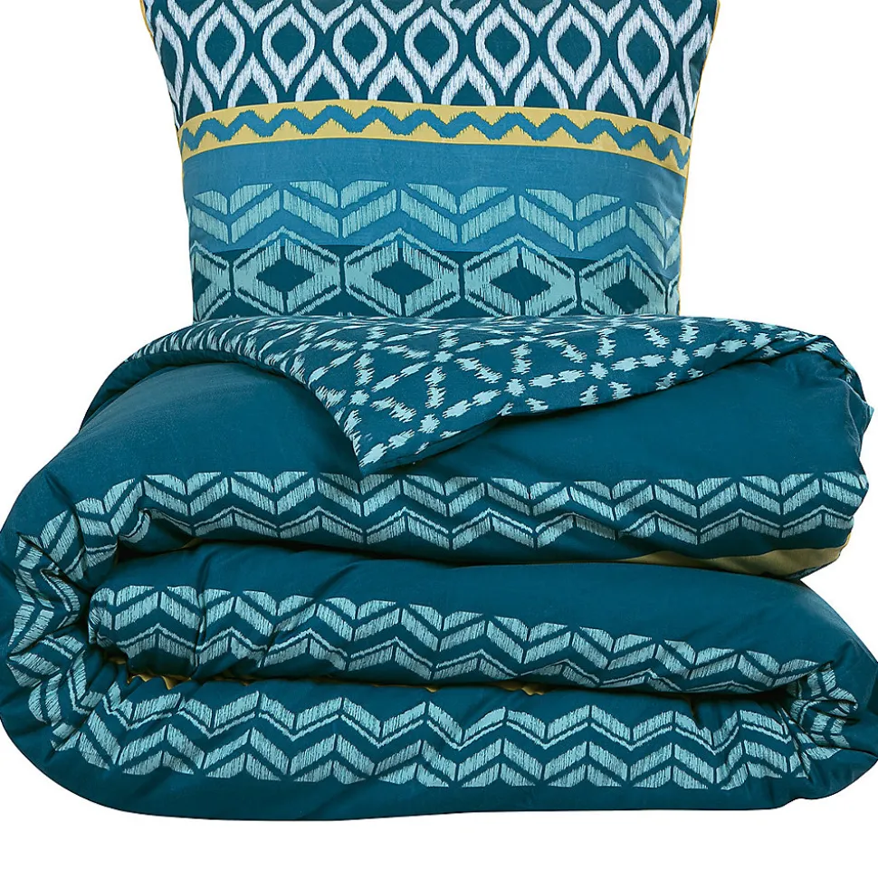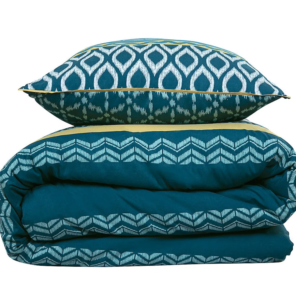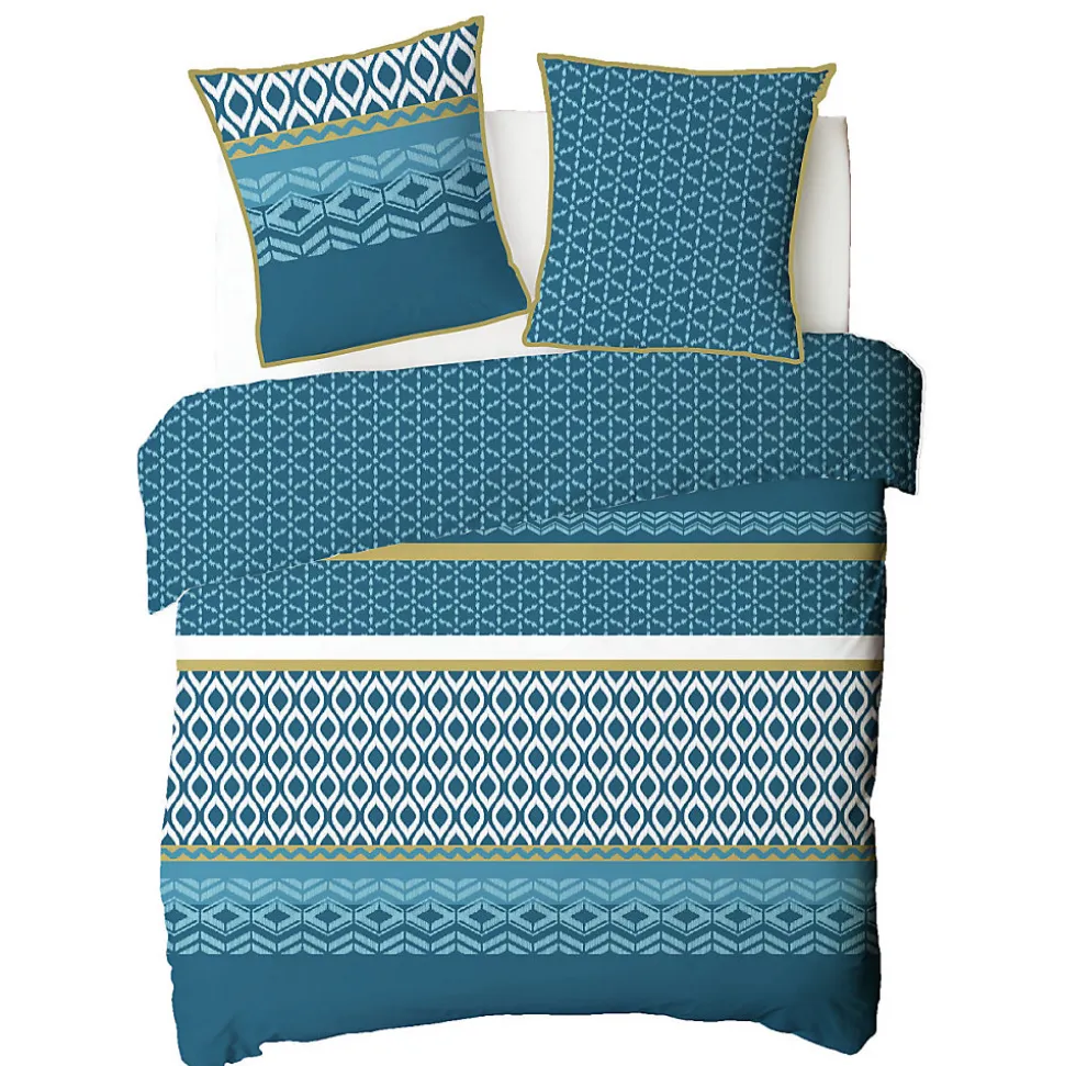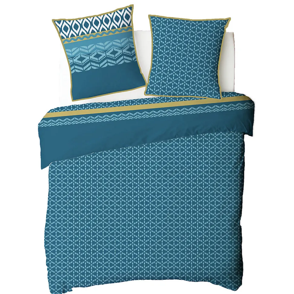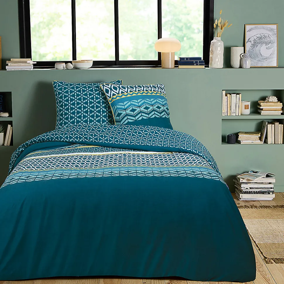 Parure de lit en microfibre réversible imprimé ethnique TRIBAL – comprenant 1 housse de couette + 2 taies d’oreiller 63x63cmPlongez dans une ambiance ethnique et apaisante avec la parure de lit Tribal. Son design réversible et son imprimé géométrique dans des tons bleus apportent une touche de caractère et de modernité à votre chambre. L’association harmonieuse de ses motifs graphiques et de sa palette de couleurs profondes crée une atmosphère enveloppante, idéale pour des nuits sereines et confortables.Les taies d’oreiller assorties complètent parfaitement l’ensemble pour une décoration cohérente et raffinée. Conçue pour votre bien-être, la parure Tribal est certifiée Oeko-Tex et lavable en machine à 30°, garantissant un entretien facile et une excellente durabilité.Fabriquée en microfibre lavée, elle offre un toucher effet peau de pêche ultra doux, vous enveloppant dans un cocon de confort chaque nuit.Laissez-vous séduire par l’élégance et l’originalité de Tribal, une parure qui transforme votre espace nuit en un véritable havre de style et de douceur.À compléter avec nos draps housse de la collection ESSENTIEL – FUTURE HOME.COMPOSITIONS PRODUIT :Matière : 100% Polyester – Microfibre lavée – effet peau de pêcheCouleurs : Bleu pétroleFinition des taies : BiaisFinition de la housse de couette : BoutonsCertification : OEKO-TEXLavage : à 30°C en machine2 taies d’oreiller 63x63cmEn savoir plus :Ce produit labélisé STANDARD 100 by OEKO-TEX – certificat n° 18.HPK48415 HOHENSTEIN HTTI suit un processus de fabrication certifié et contrôlé, respectueux de votre peau. Le STANDARD 100 by OEKO-TEX EST un label qui vous garantit que vos draps ne contiennent aucuns produits toxiques pour votre santé.