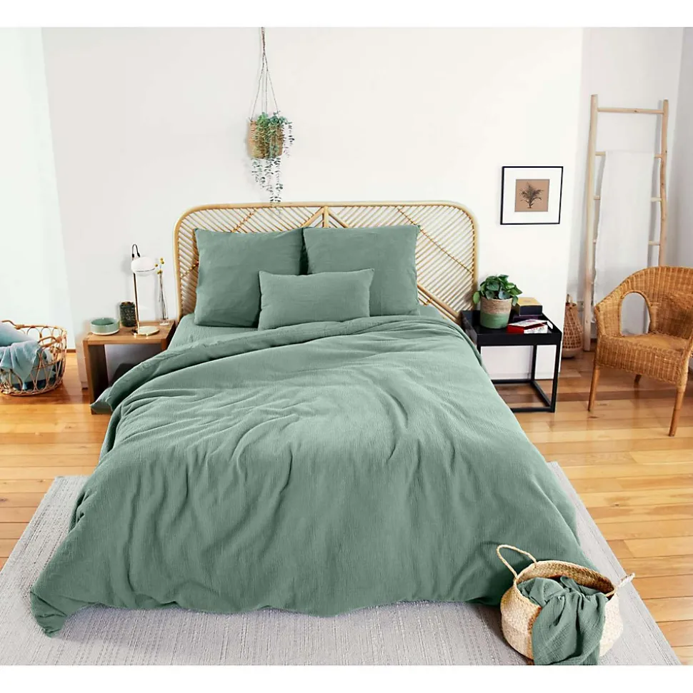 Confectionnée avec un tissu de qualité supérieure en double gaze de coton léger, cette parure vous offre une expérience de sommeil luxueuse tout en apportant une touche de charme et de simplicité à votre chambre.FICHE TECHNIQUE- Parure de couette comprenant une housse de couette et deux taies d’oreiller- Matière : recto double gaze de coton 140 g/cm², verso 100% coton 57 fils/cm²- Tissu certifié OEKO-TEX- Avec boutons et passes-mains- Couleur : Amande- Convient parfaitement pour un lit 2 placesCARACTERISTIQUES TECHNIQUES- Dimensions de la housse de couette : L. 260 cm x l. 240 cm- Dimensions de la taie d’oreiller : L. 63 x l. 63 cm- Poids : 2,138 kg