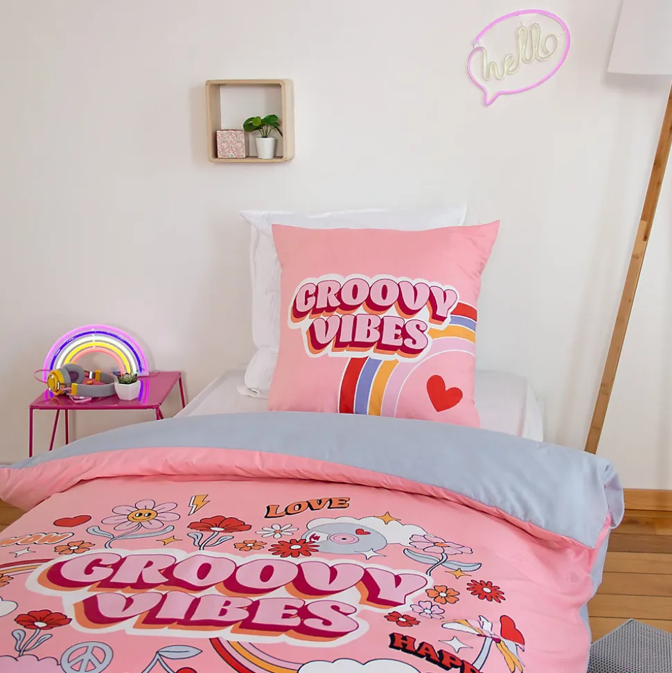 Parure de lit enfant GROOVY VIBES 140×200 cm en microfibre rose 2 piècesInvitez une ambiance fun et colorée dans la chambre de votre enfant avec la parure de lit « Groovy Vibes. » Inspirée des motifs joyeux et décalés des années 70, cette parure aux tons doux et vifs apporte un style rétro plein de caractère. Conçue en microfibre légère (72 g/m2), elle est douce au toucher et idéale pour garantir des nuits confortables et agréables.La parure comprend une housse de couette de 140×200 cm ainsi qu’une taie d’oreiller de 63×63 cm, parfaitement adaptées pour un lit d’enfant. Son tissu microfibre assure un entretien facile, résistant aux lavages fréquents tout en conservant sa douceur et ses couleurs vibrantes. Sur un fond rose éclatant, les motifs « Groovy Vibes, » entourés de fleurs, cœurs et petits symboles pop, créent une atmosphère joyeuse et positive, propice aux rêves et à l’imagination.Avec la collection « Groovy Vibes, » chaque détail a été pensé pour apporter de la bonne humeur et un confort optimal au quotidien. C’est la parure parfaite pour transformer la chambre de votre enfant en un espace dynamique et plein de vie.Côté technique :Composition : 100% polyesterMatière : microfibreGrammage : 72 g/m2Motifs : ImpriméColoris : RoseFinition : Housse de couette sans rabat, fermeture boutons et passe-mains forme rectangulaireTaies d’oreillers carrées 63×63 cm forme sac avec rabatFabriqué au PakistanLes plus du produit :Deux faces sur la parure de litCollection GROOVY VIBES disponible en parure de lit 140×200 cm avec une taie d’oreiller 63×63 cm.Côté pratique :Entretien facile : lavage en machine à 40°C; séchage en sèche-linge à température réduite; javel et chlore interditsConseils : Lavez votre linge avant la première utilisat