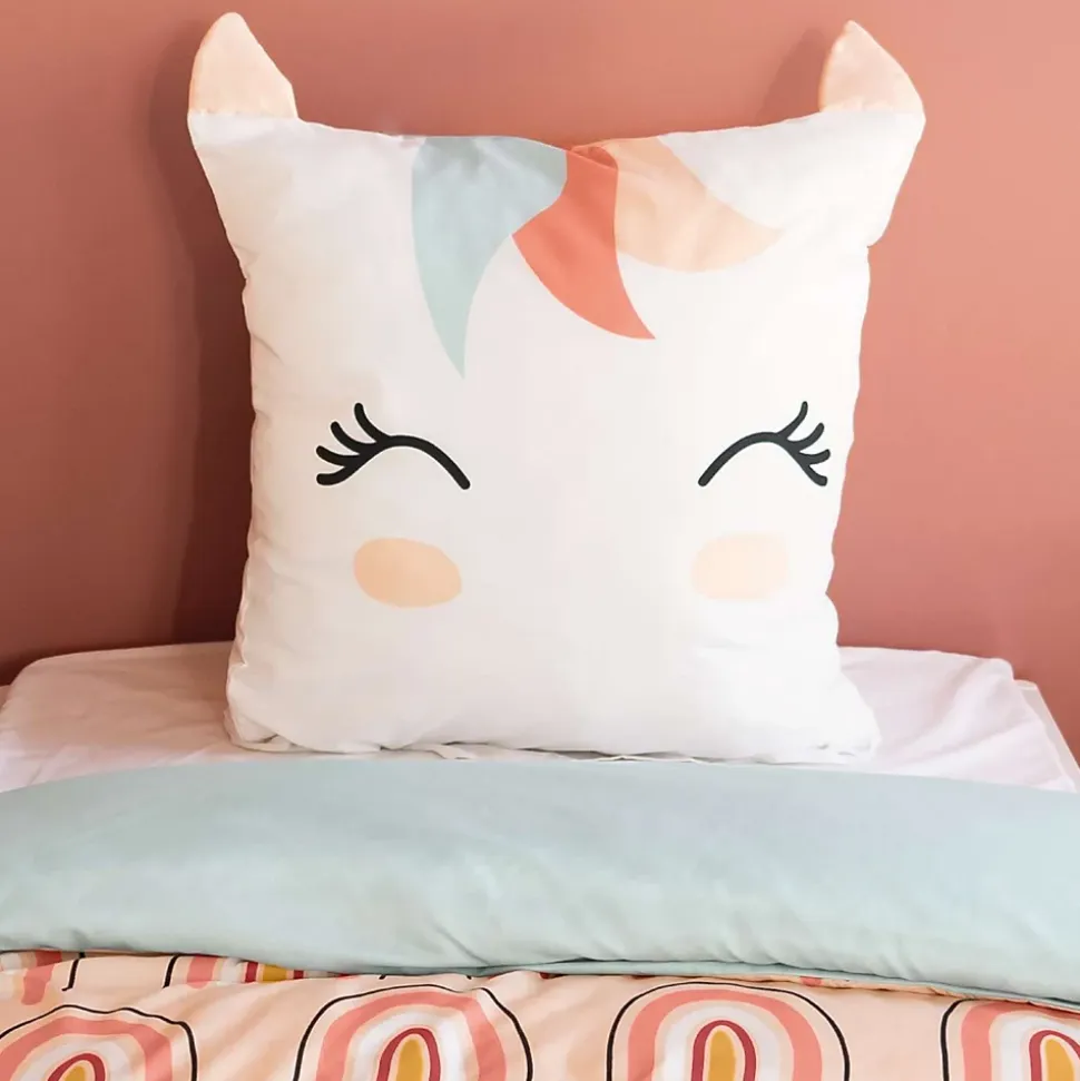 Cette parure associe un visage librement inspiré d’une licorne et un imprimé vitaminé parsemé d’arcs en ciel.FICHE TECHNIQUE- Parure comprenant une housse de couette et une taie d’oreiller- Matière : 100% polyester 72g/m²- Tissu certifié OEKO-TEX- Oreilles rembourrées- Avec pressions et passes-mains- Couleur : Multicolore- Convient parfaitement pour un lit 1 placeCARACTERISTIQUES TECHNIQUES- Dimensions de la housse de couette : L. 200 cm x l. 140 cm- Dimensions de la taie d’oreiller : L. 63 x l. 63 cm- Poids : 0,508 kg