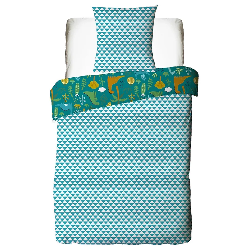 Découvrez notre parure de lit DINO, fabriquée à 100% en coton, offrant une sensation douce et légère pour des nuits particulièrement confortables. Avec ses draps colorés ornés de motifs de dinosaures, votre enfant sera transporté dans un sommeil paisible. La housse de couette et la taie d’oreiller réversibles permettent de varier les ambiances avec ses motifs géométriques aux tons doux de blanc et de vert.Créée par nos stylistes, cette parure de lit en tissage 57 fils/cm² comprend une housse de couette réversible avec une finition à boutons, garantissant que la couette reste bien en place.Caractéristiques du Produit :1 housse de couette 140x200cm + 1 taie d’oreiller 63x63cmMatière 100% cotonNombre de fils : 57 fils/cm²Certification OEKO-TEXLavage en machine à 60°Certification STANDARD 100 by OEKO-TEX : Certificat n° 18.HPK48415 HOHENSTEIN HTTI, garantit une fabrication contrôlée et respectueuse de votre peau. Ce label assure l’absence de substances toxiques, préservant votre santé et la planète.Soucieux de l’impact de nos produits ? Nous aussi ! La parure de lit DINO est livrée dans un pochon en tissu réutilisable assorti aux motifs de la housse de couette, qui peut être transformé en tote-bag une fois les draps installés.