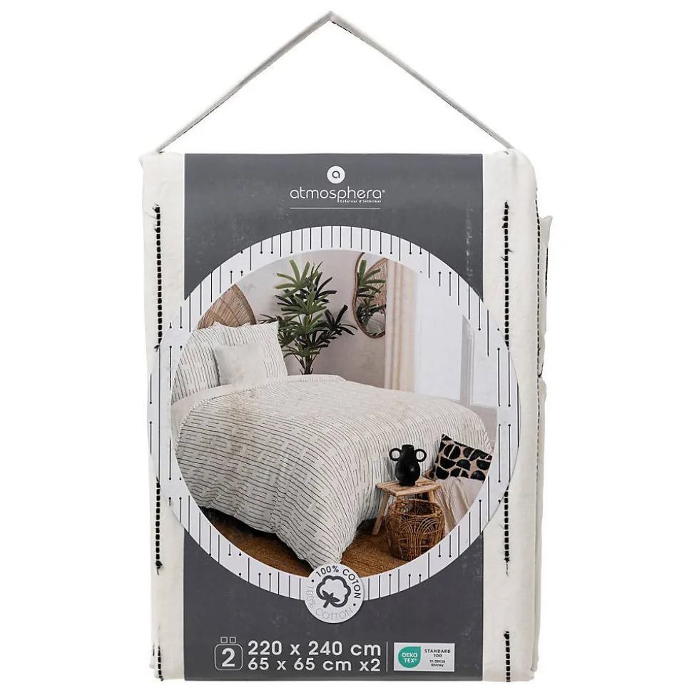 Si vous aimez la décoration ethnique chic, la parure de lit « Kain » Atmosphera conviendra parfaitement à votre chambre à coucher.Une matière naturelleLa parure de lit « Kain » comporte une housse de couette accompagnée de deux taies d’oreiller carrées. Confectionnée en coton, elle se nettoiera facilement en machine à laver. Par ailleurs, elle est dotée d’une fermeture à boutons.Ajoutez un jeté de lit Atmosphera aux couleurs contrastantes pour donner du relief à la parure de lit « Kain ».Le petit plus décoUne belle tête de lit en roseau ou en rotin donnera tout de suite un côté exotique à votre pièce.