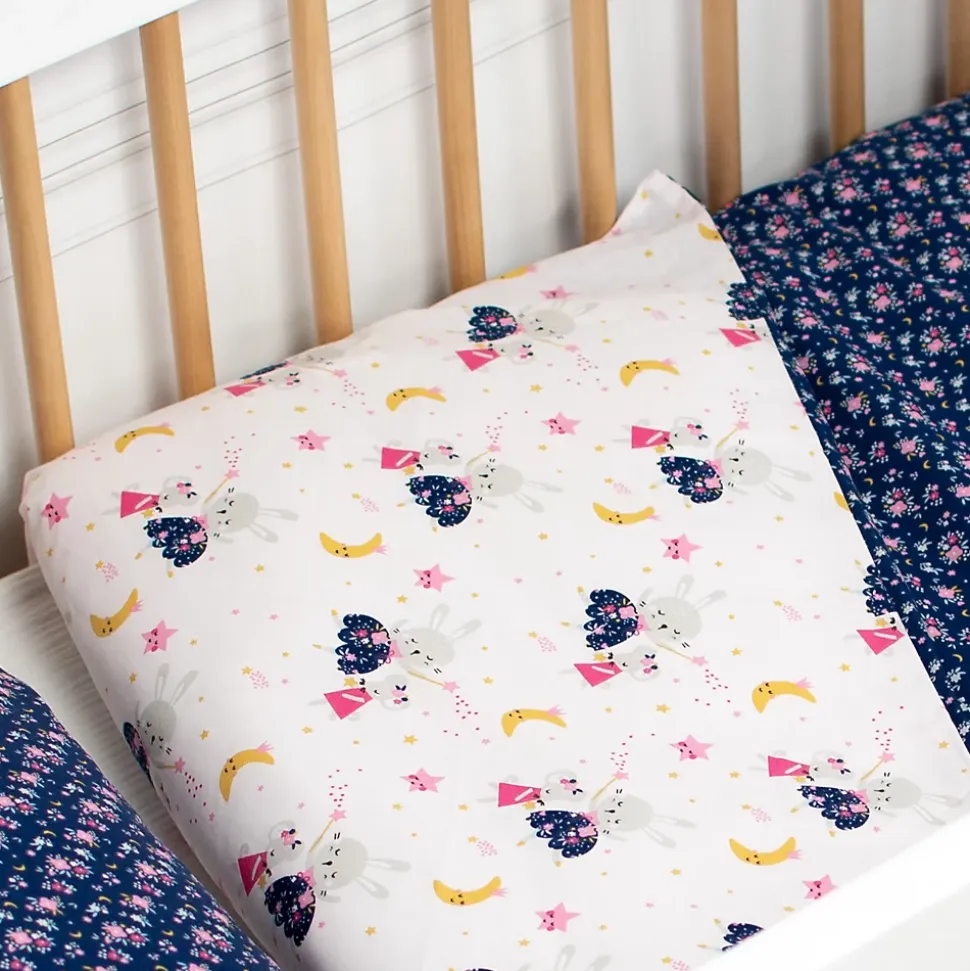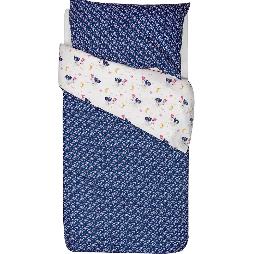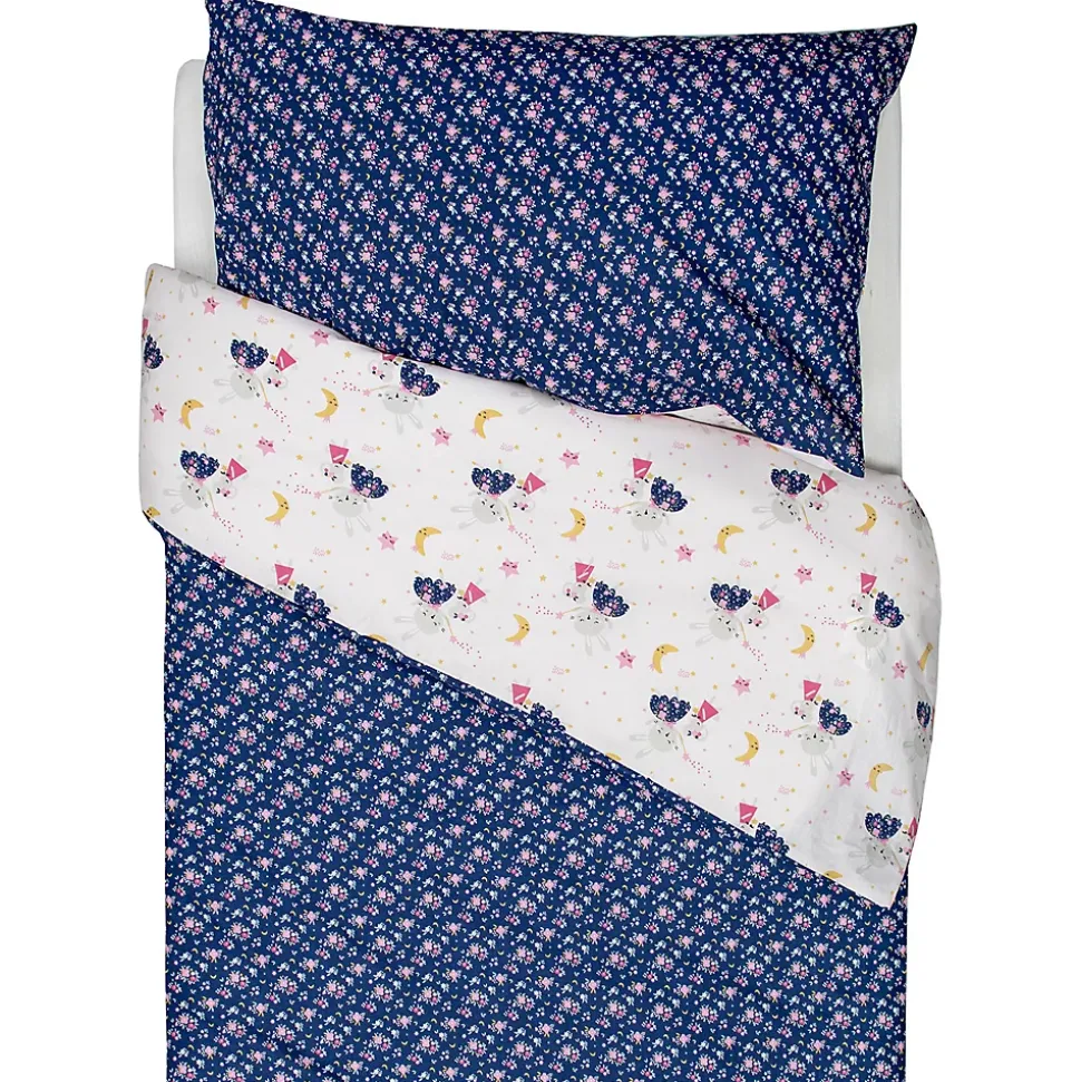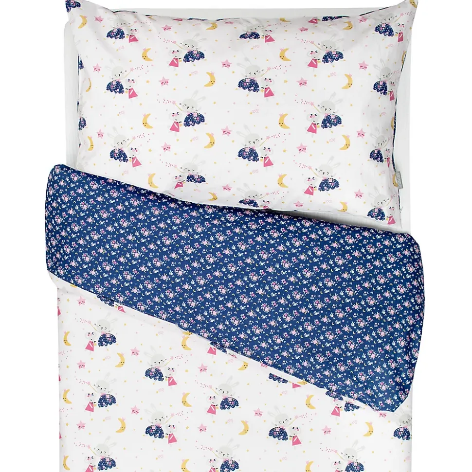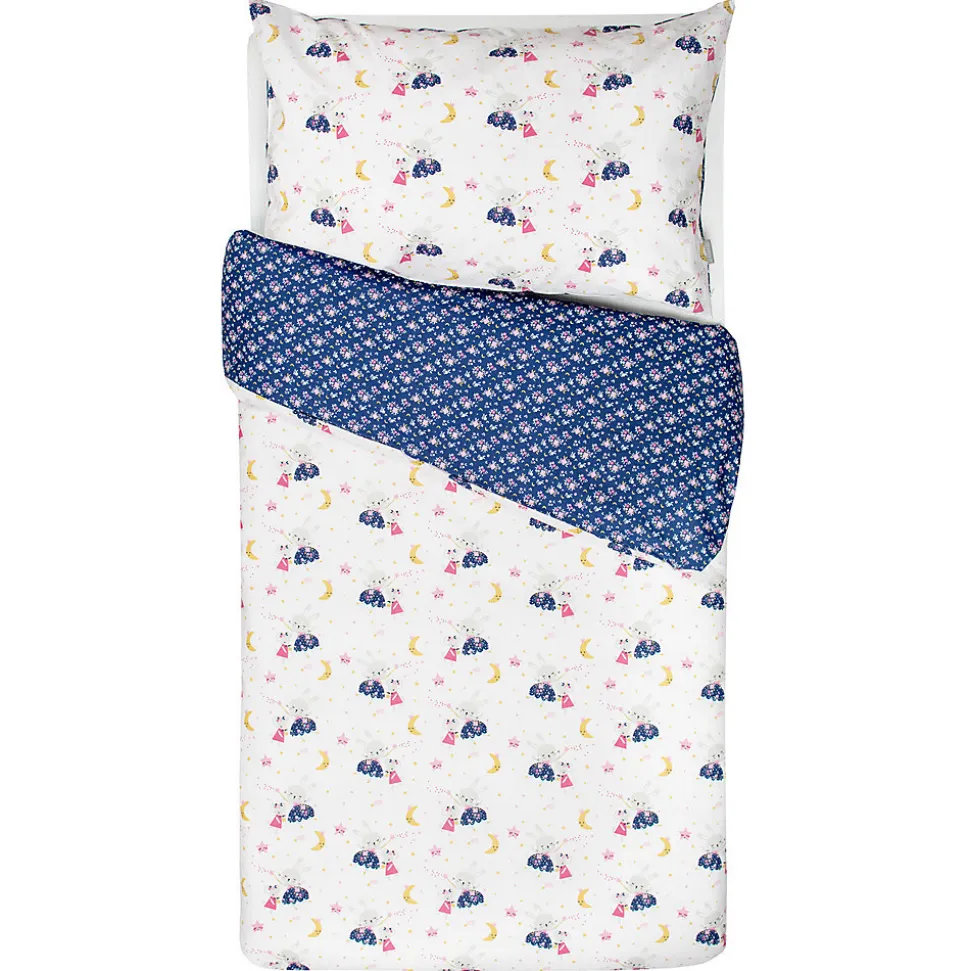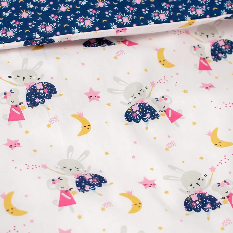 - Parure réversible : un côté féérique (lapin, étoiles, souris magique) et un côté floral liberty sur fond bleu nuit