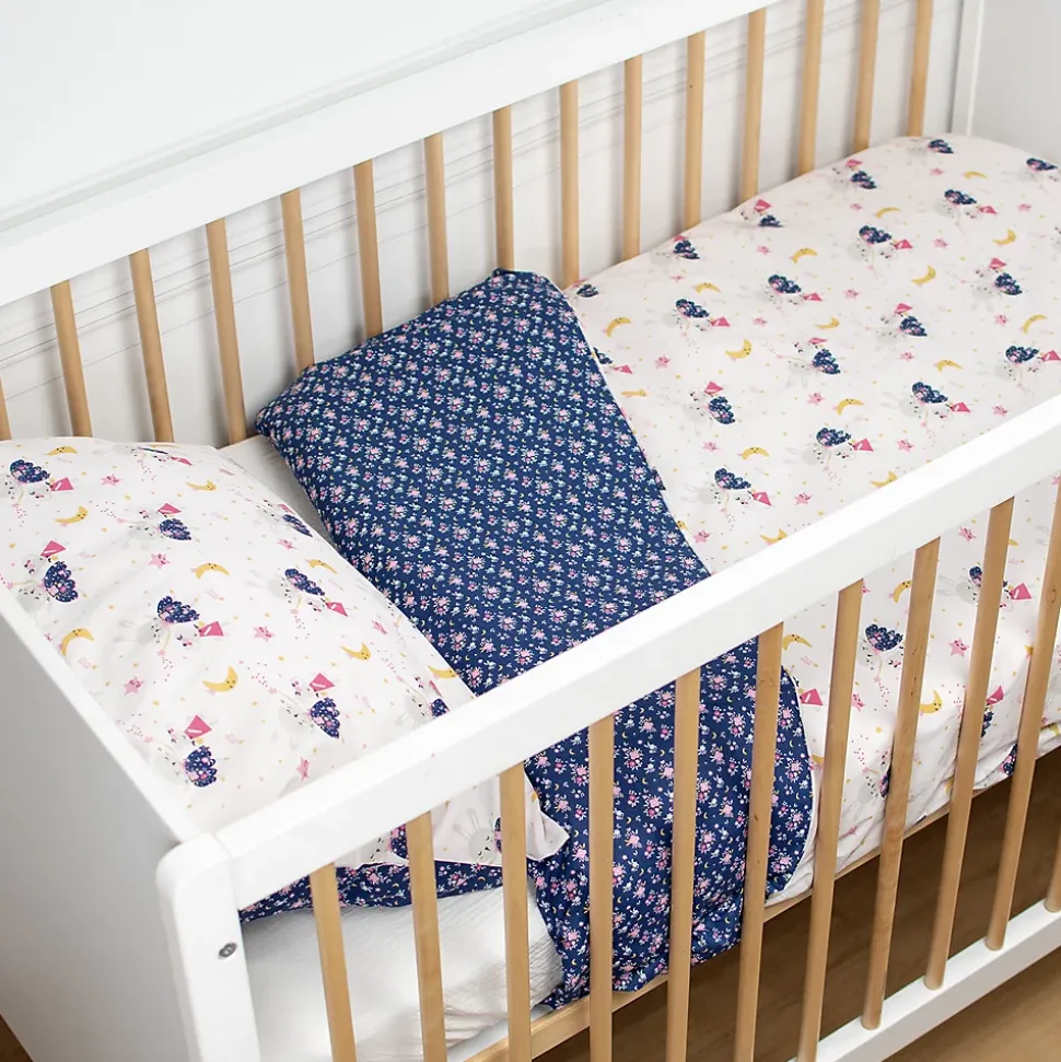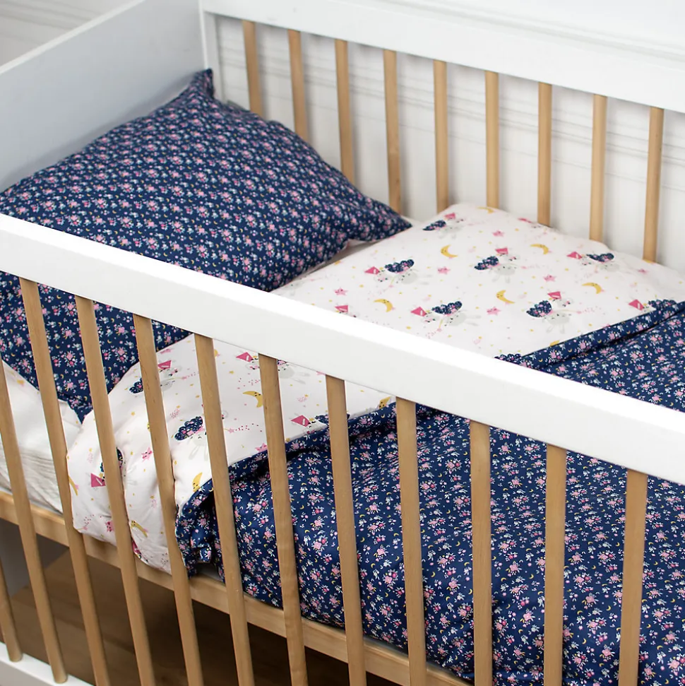 Parure de lit bébé réversible en coton et son motif floral féérique. Douceur, respirabilité et confort toute l’année. Fabriqué en Europe.
