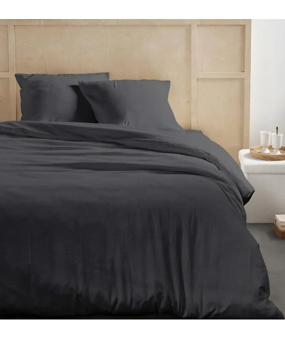 Cette parure de lit en gaze de coton Today composée d’une housse de couette 240 x 220 cm et de 2 taies d’oreillers 63 x 63 cm pour un lit 2 personnes accompagnera vos nuits et vous offrira un confort de sommeil inégalable. Sa composition 100% gaze de coton de qualité supérieure garantit douceur et respirabilité, avec un design minimaliste et élégant en couleur fusain. Facile à laver et à entretenir, elle séduira par son style et sa praticité.