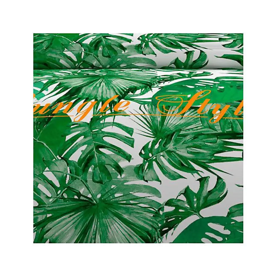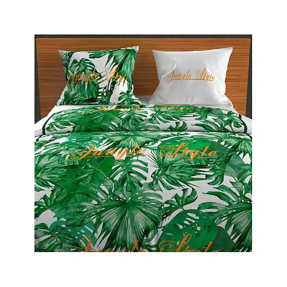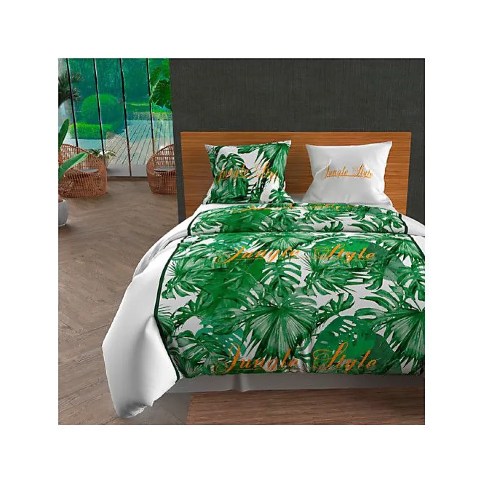 Linge de lit imprimé en pur coton pour grand lit 2 personnes. Qualité supérieure, tissage serré. Couleur: – Vert et Blanc. – Style ‘Jungle’. Composition: – 100 % coton 57 fils/cm2. Parure de lit: – housse de couette: 260×240 cm avec rabat de 40 cm. – 2 taies d’oreiller dessin placé 63×63 cm. Entretien: – Entretien facile – Lavage 40° en machine