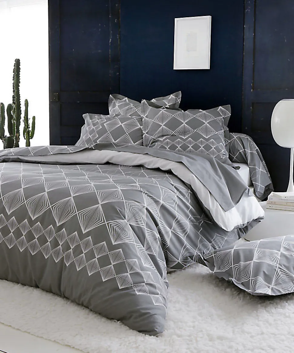 Parure housse de couette 100% pur coton peigné. Sublimez votre chambre avec ses imprimés géométriques et sa pureté en coloris gris.Caractéristiques :Matière : 100% pur coton peigné, fibres longues – 57 fils/cm2.Elle comporte une housse de couette + 1 taie ou 2 suivant la dimension de la housse de couette.Cette housse de couette possède un rabat de maintien de 37 cm aux pieds en forme de cheminée pour une tenue optimale.Dimension taie d’oreiller: 65 x 65 cm.Dimensions housse couette : 140 x 200 cm, 200 x 200 cm, 240 x 220 cm, 260 x 240 cm. Ce modèle est signé Tradilinge, fabrication française.