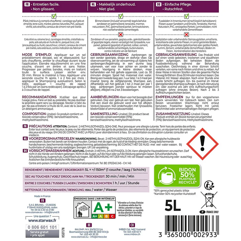 Ce produit crée un film transparent non glissant, qui protége les sols de l’usure et des taches en facilite l’entretien Crée une brillance permanente et protège en une seule opération Peut s’appliquer sur un sol chauffant (dans ce cas, arrêter le chauffage par le sol au préalable et durant l’application)