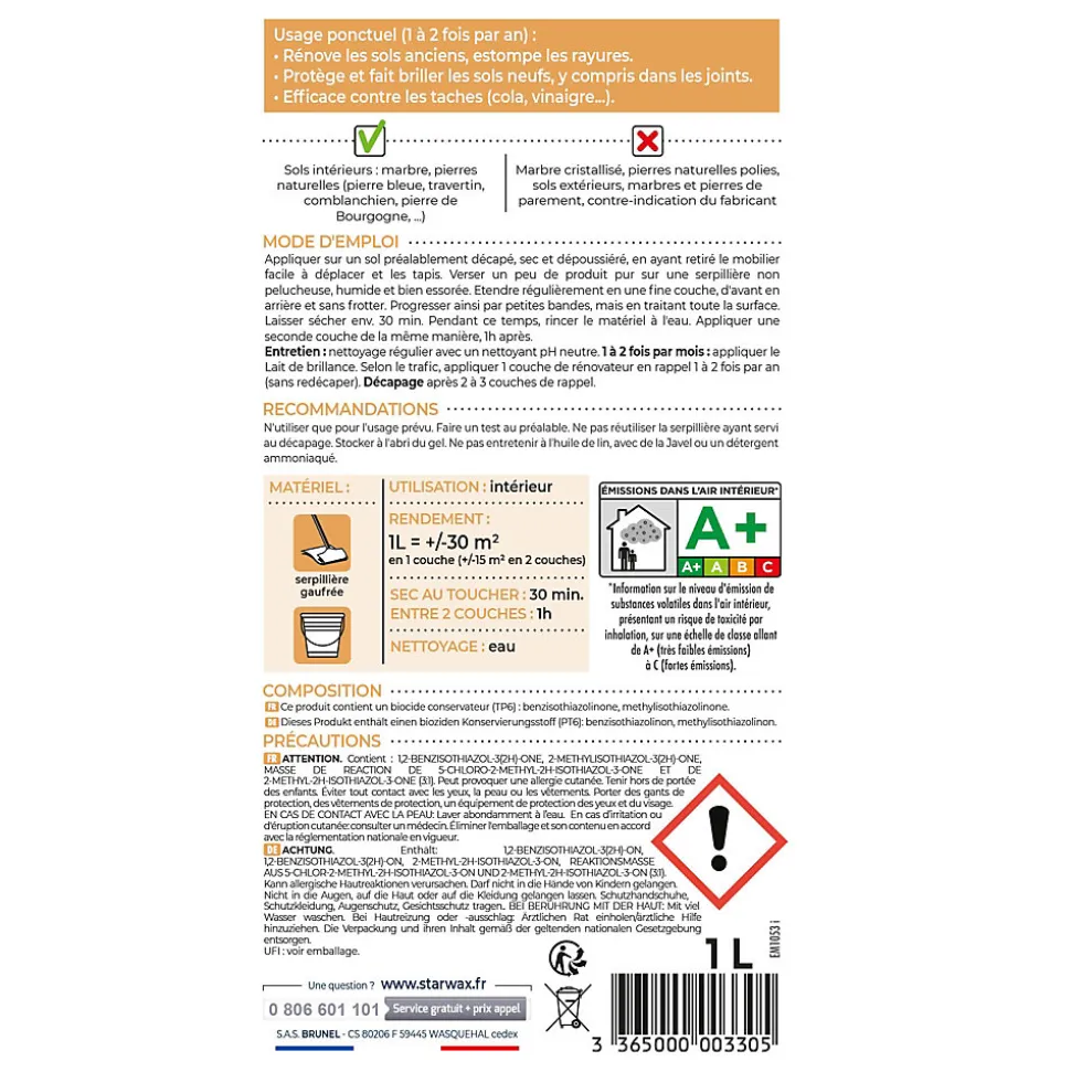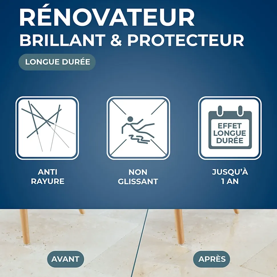 Utilisé pur, crée une protection très résistante contre l’usure et les taches. Apporte une brillance longue tenue. Utilisé en dilution, permet l’entretien et le nettoyage courant. Produit 2 en 1 formule spécialement adaptée aux marbres et pierres calcaires (travertin, comblanchien, terrazo, granito). Non glissant