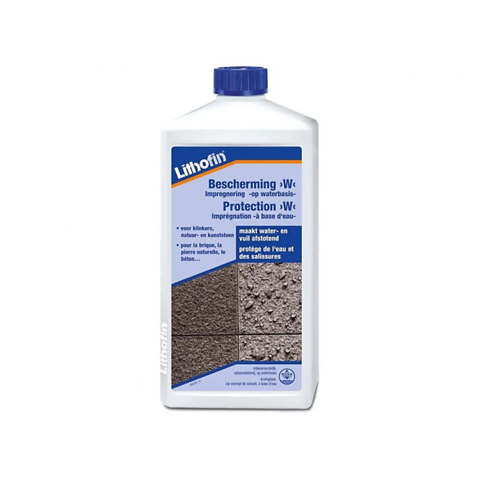 Protection W – Imprégnation hydrofuge pour les pierres naturelles – LithofinImprégnation hydrophobe à base de composés de siliconates hydrofuges. Le produit est sans solvants, inodore et d’utilisation universelle.L’apparition de décoloration est extrêmement limitée, il se traite facilement, rapidement et en toute sécurité.Lithofin Protection W est résistant à l’humidité résiduelle, pénètre bien dans les surfaces poreuses et rend les surfaces minérales hydrofuges une fois séchées. L’eau et les polluants qu’elle contient ne sont plus absorbés, mais dégoulinent de la surface.Ainsi, les surfaces demeurent propres plus longtemps, sont moins sensibles à l’encrassement et plus faciles à entretenir. la capacité de diffusion de la vapeur d’eau reste quant à elle inchangée.L’aspect du revêtement traité n’est pas modifié ou uniquement de manière insignifiante. Le produit et résistant au UV et au jaunissement.Spécifications techniques :Densité: env. 1,0 g/cm³pH : env. 13Point de flamme : n.c.Aspect : incolore, transparentOdeur : non spécifiqueSolubilité dans l’eau : solubleDomaine d’application :Protection W s’utilise aussi bien à l’intérieur qu’à l’extérieur pour l’équipement antisalissure et hydrofuge de revêtements absorbants et de façades en pierre naturelle comme le granite et la pierre calcaire, le grès ainsi que pour le brique, les panneaux en argile et en clinker, le parpaing en béton, le béton lavé, etc.Attention : ne convient pas aux pierres calcaires polies ni au béton (parpaings) frais.Remarque : en cas de revêtements sensibles aux taches, nous recommandons