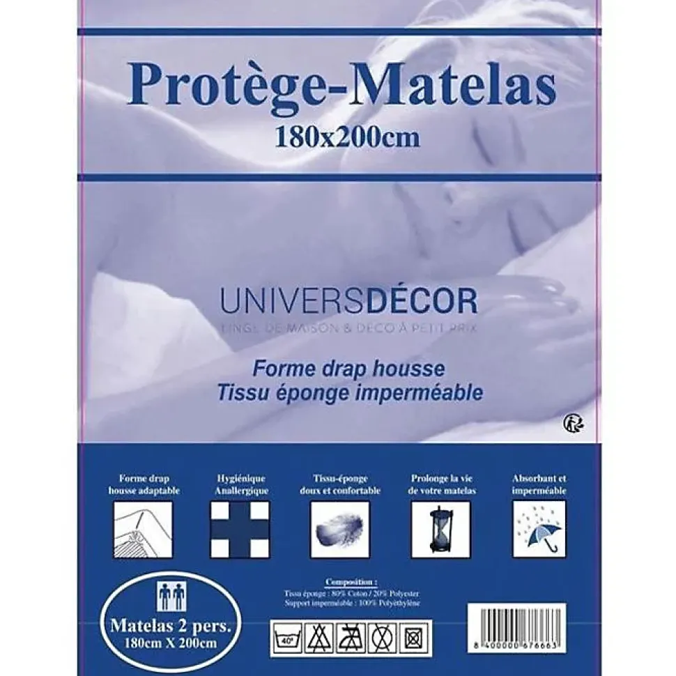 Protège matelas imperméables, absorbant et anti-acariens Composition : Dessus éponge 20% polyester / 80% Coton Dessous plastifié PEVA Bonnet extensible jusqu’à 25 cm Disponible en 4 dimensions au choix : 160 x 200 cm pour lit 2 places king size Conseil d’entretien: Nous vous conseillons un prélavage à 30° avant la première utilisation Les points forts de ce produit: Enveloppe à la perfection tout types de matelas.