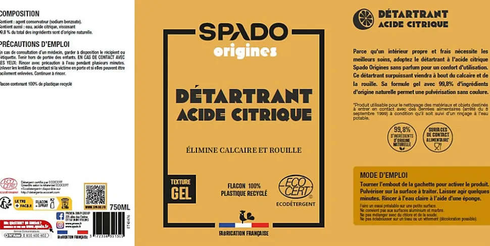 Acide citrique en gel prêt à l’emploi. Élimine efficacement le calcaire et la rouille. Sa texture gélifiée permet de cibler la surface à traiter. Compatible contact alimentaire. Ingrédients actifs 100% d’origine naturelle. Ecocert