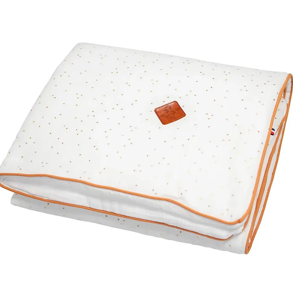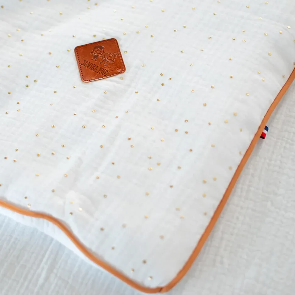 La première couverture bébé en gaze de coton – douceur et multi-usages !Offrez à votre bébé le confort d’une couverture légère et douce pour ses premiers moments sous une couette. Idéale pour le transitionner après la gigoteuse, cette couverture en gaze de coton assure à bébé un nid de tendresse. Nomade et pratique, elle peut être facilement transportée partout, accompagnant votre enfant lors de ses siestes ou moments de détente.Polyvalente, cette couverture multi-usage peut servir dans diverses situations :Plaid pour les sorties, légère et aéréeLinge de lit couffin, berceau on la utilise souvent comme la première couetteTapis d’éveil d’appoint pour offrir un douillet pendant les moments de jeu.Couvre-lit pour apporter une ambiance cocooning à la chambre de bébé.Caractéristiques de la première couverture bébé en coton – Made in FranceTaille : 70 x 100 cm, idéale pour envelopper bébé.Double face en 100% gaze de coton, offrant douceur et respirabilité.Doublé et ouatiné avec un garnissage en fibres creuses siliconées, également fabriqué en France.Personnalisable : Rendez cette couverture unique en la personnalisant avec le de votre enfant ou un motif spécial. Une soignée en fait un cadeau mémorable, idéal pour une naissance ou toute autre occasion spéciale.Fabrication locale : Conçue et produite dans nos ateliers en France pour une qualité de fabrication irréprochable.Coton et garnissage issus de matériaux certifiés REACH, garantissant des matières pour la santé et