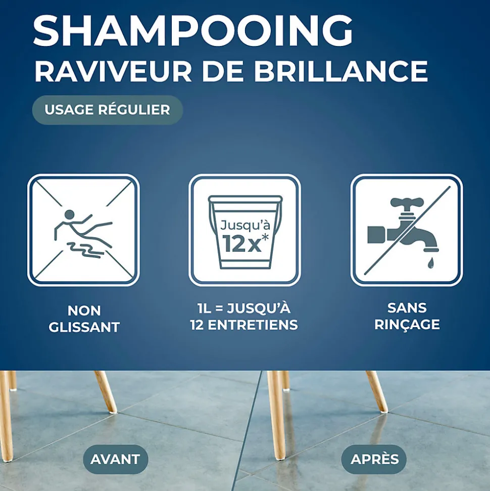 Ce shampooing permet de donner un aspect soyeux aux sols brillants ou satinés Nettoie, fait briller en 1 seule opération et prolonge la durée de vie de la protection
