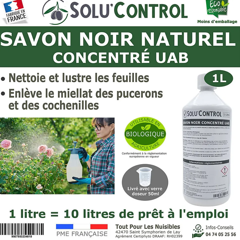 Le savon noir concentré est un produit naturel, à base de grignons d’olive, à diluer dans l’eau avant utilisation.Certifié pour l’Agriculture BiologiqueConforme au règlement CE 2018/848, ce savon noir peut être utilisé en agriculture biologique, garantissant une approche durable et saine.Utilisation Polyvalente Tout au Long de l’AnnéeCe savon noir concentré, naturel, est votre allié pour un nettoyage efficace sans compromettre la sécurité de votre espace ou de la nature.Usages à la MaisonSurfaces : Diluez le savon pour nettoyer plans de travail, carrelages et autres surfaces lavables. Il dégraisse et fait briller sans traces.Sols : Quelques cuillères à soupe dans un seau d’eau suffisent pour laver parquet, carrelage ou linoléum.Linge : Ajoutez-le à votre lessive pour un linge propre et frais, efficace contre les taches.Vaisselle : Une petite dose dans l’eau chaude dégraisse et nettoie sans effort.Usages au JardinOutils et mobilier : Solution diluée pour nettoyer pots, outils et mobilier, protège aussi contre la rouille.Animaux : Nettoie et fait briller le pelage.Feuilles : Pulvérisez une solution diluée pour éliminer le miellat et prévenir la fumagine.Atouts pratiquesConcentré permettant de limiter les emballages. Utilisez votre propre pulvérisateur.Fabriqué en France à partir de grignons d’olives d’origine française, favorisant le circuit court et l’économie locale.Préparation : Diluer 50 ml de concentré dans ½ litre d’eau pour une solution prête à l’emploi.Précautions :Tester sur une petite surface avant usage.Ne pas ingérer. En cas de contact avec les yeux, rincer abondamment.Notre savon noir concentré est la solution idéale pour entretenir efficacement maison et jardin.