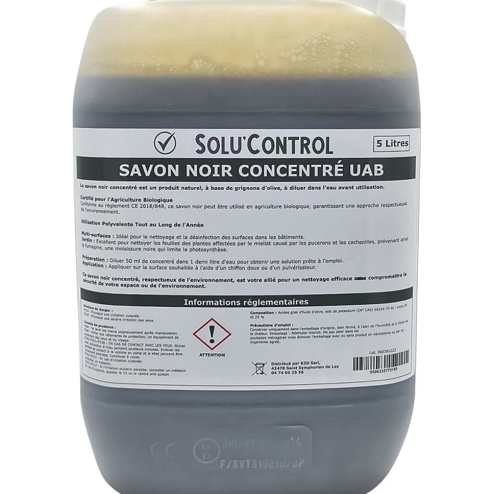 Le savon noir concentré est un produit naturel, à base de grignons d’olive, à diluer dans l’eau avant utilisation.Certifié pour l’Agriculture BiologiqueConforme au règlement CE 2018/848, ce savon noir peut être utilisé en agriculture biologique, garantissant une approche durable et saine.Utilisation Polyvalente Tout au Long de l’AnnéeCe savon noir concentré, naturel, est votre allié pour un nettoyage efficace sans compromettre la sécurité de votre espace ou de la nature.Usages à la MaisonSurfaces : Diluez le savon pour nettoyer plans de travail, carrelages et autres surfaces lavables. Il dégraisse et fait briller sans traces.Sols : Quelques cuillères à soupe dans un seau d’eau suffisent pour laver parquet, carrelage ou linoléum.Linge : Ajoutez-le à votre lessive pour un linge propre et frais, efficace contre les taches.Vaisselle : Une petite dose dans l’eau chaude dégraisse et nettoie sans effort.Usages au JardinOutils et mobilier : Solution diluée pour nettoyer pots, outils et mobilier, protège aussi contre la rouille.Animaux : Nettoie et fait briller le pelage.Feuilles : Pulvérisez une solution diluée pour éliminer le miellat et prévenir la fumagine.Atouts pratiquesConcentré permettant de limiter les emballages. Utilisez votre propre pulvérisateur.Fabriqué en France à partir de grignons d’olives d’origine française, favorisant le circuit court et l’économie locale.Préparation : Diluer 50 ml de concentré dans ½ litre d’eau pour une solution prête à l’emploi.Précautions :Tester sur une petite surface avant usage.Ne pas ingérer. En cas de contact avec les yeux, rincer abondamment.Notre savon noir concentré est la solution idéale pour entretenir efficacement maison et jardin.