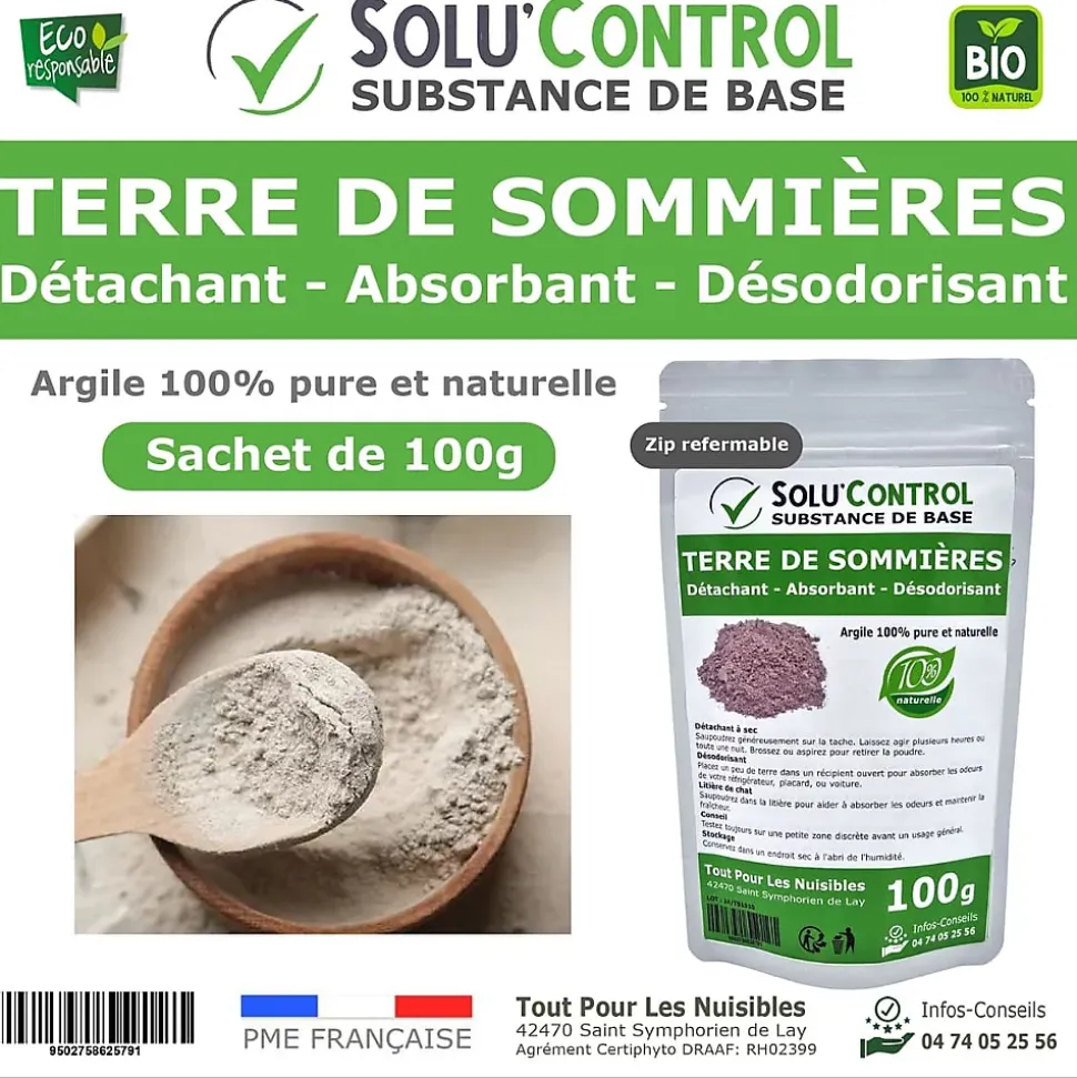 La terre de Sommières est une argile 100 % naturelle.Idéale comme détachant puissant pour les textiles, le cuir et les sols. Elle élimine efficacement les taches tenaces et absorbe les odeurs désagréables sans utiliser de produits chimiques nocifs.Ce produit est également un allié de choix pour neutraliser les odeurs d’urine et maintenir les litières de chat fraîches et propres.Ce produit naturel et sûr convient parfaitement à tous les foyers. Présenté dans un sac de 100 g, il offre une solution économique pour vos besoins de nettoyage et d’assainissement. DÉTACHANT NATUREL : Cette terre de Sommières 100% argile pure et naturelle agit comme un puissant détachant pour textiles, cuirs et sols. ABSORBANT ET DÉSODORISANT : Élimine efficacement les taches tenaces et absorbe les odeurs désagréables sans produits chimiques. SACHET REFERMABLE : Pratique sachet zippé pour une utilisation facile et hygiénique. ARGILE 100% NATURELLE : ce produit est sûr pour une utilisation dans tous les foyers.