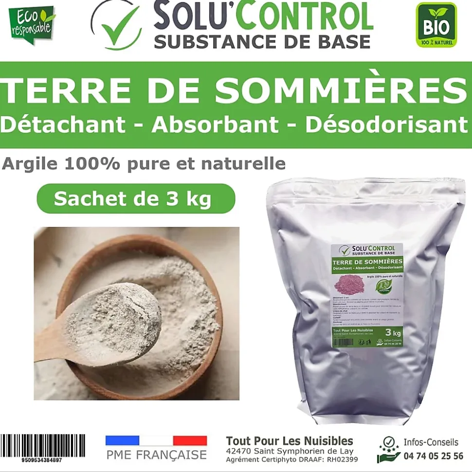 La terre de Sommières est une argile 100 % naturelle.Idéale comme détachant puissant pour les textiles, le cuir et les sols. Elle élimine efficacement les taches tenaces et absorbe les odeurs désagréables sans utiliser de produits chimiques nocifs.Ce produit est également un allié de choix pour neutraliser les odeurs d’urine et maintenir les litières de chat fraîches et propres.Ce produit naturel et sûr convient parfaitement à tous les foyers. Présenté dans un sac de 3 kg, il offre une solution saine et économique pour vos besoins de nettoyage et d’assainissement. DÉTACHANT NATUREL : Cette terre de Sommières 100% argile pure et naturelle agit comme un puissant détachant pour textiles, cuirs et sols. ABSORBANT ET DÉSODORISANT : Élimine efficacement les taches tenaces et absorbe les odeurs désagréables sans produits chimiques. SACHET REFERMABLE : Pratique sachet zippé pour une utilisation facile et hygiénique. ARGILE 100% NATURELLE : ce produit est sûr pour une utilisation dans tous les foyers.