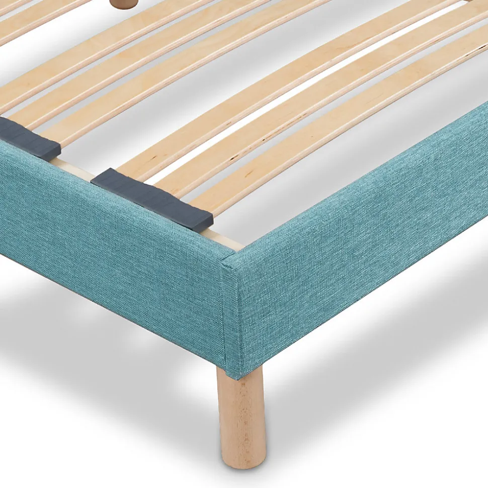 - COMPOSITION : Cadre en bois d’épicéa recouvert de tissu d’ameublement vert d’eau – Lattes en placage de bouleau – Embouts en polyéthylène – Pieds en bois de hêtre.