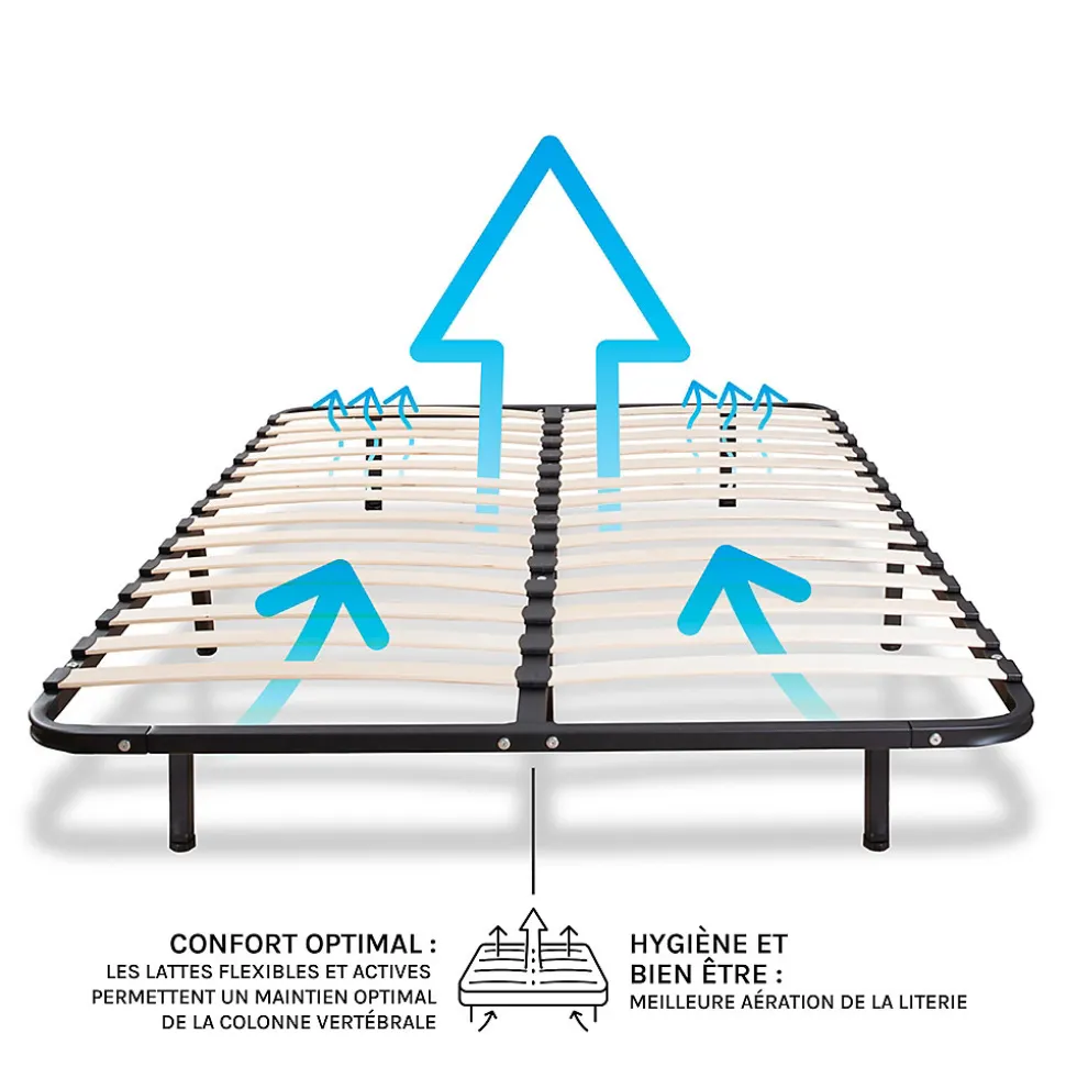 - CONFORT : Lattes flexibles – HYGIENE : Favorise l’aération du matelas.