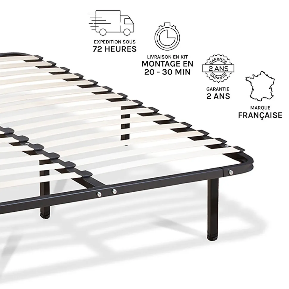 CARACTERISTIQUES :Type de sommier : Cadre à lattesSuspension : Lattes activesHauteur sommier (avec pieds) : 28 cmEpaisseur du cadre : 3 cmHauteur des pieds : 25 cmNombre de pieds (inclus) : 6Nombre de lattes : 14Dimensions des lattes : 53 mm de largeur – 9 mm d’épaisseurConmposition : Structure, lattes, pieds, fixations et visserieConditionnement : En kitGarantie : 2 ansCOMPOSITION :Cadre : Métal (peinture époxy)Lattes : Bois multiplis (peuplier)Pieds : Métal (peinture époxy)POINTS FORTS :Structure robuste : Cadre tubulaire en métal avec peinture époxy résistante aux chocs et à la corrosion.Soutien optimal : Lattes en bois multiplis de peuplier, solides et flexibles.Montage facile : Assemblage rapide avec pieds et visserie inclus.Bonne aération : Structure ouverte pour une meilleure circulation de l’air.Compatible : Adapté à tous types de matelas (mousse, latex, ressorts).Design moderne : Finition noire élégante, facile à intégrer.Transport pratique : Livré en kit compact, idéal pour les petits espaces.Excellent rapport qualité/prix : Solution économique et confortable, sans compromis.MONTAGE :Montage facile en 20 à 30 minutes.
