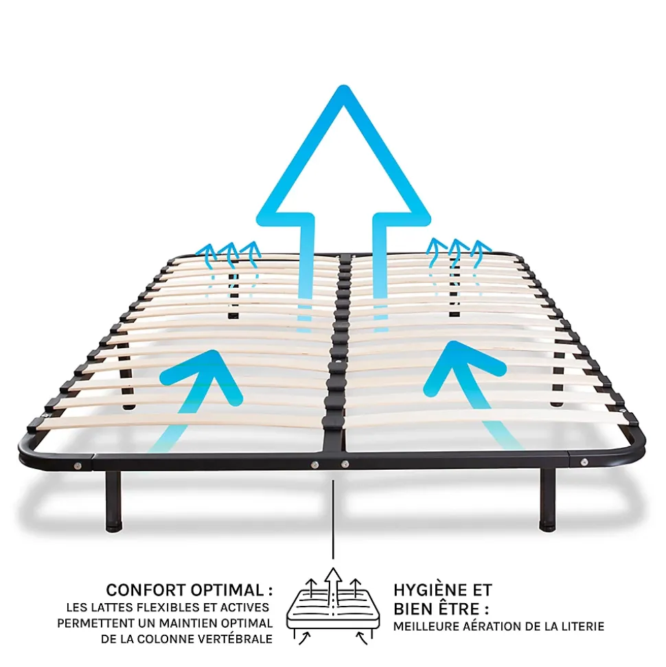 - CONFORT : Lattes flexibles – HYGIENE : Favorise l’aération du matelas.