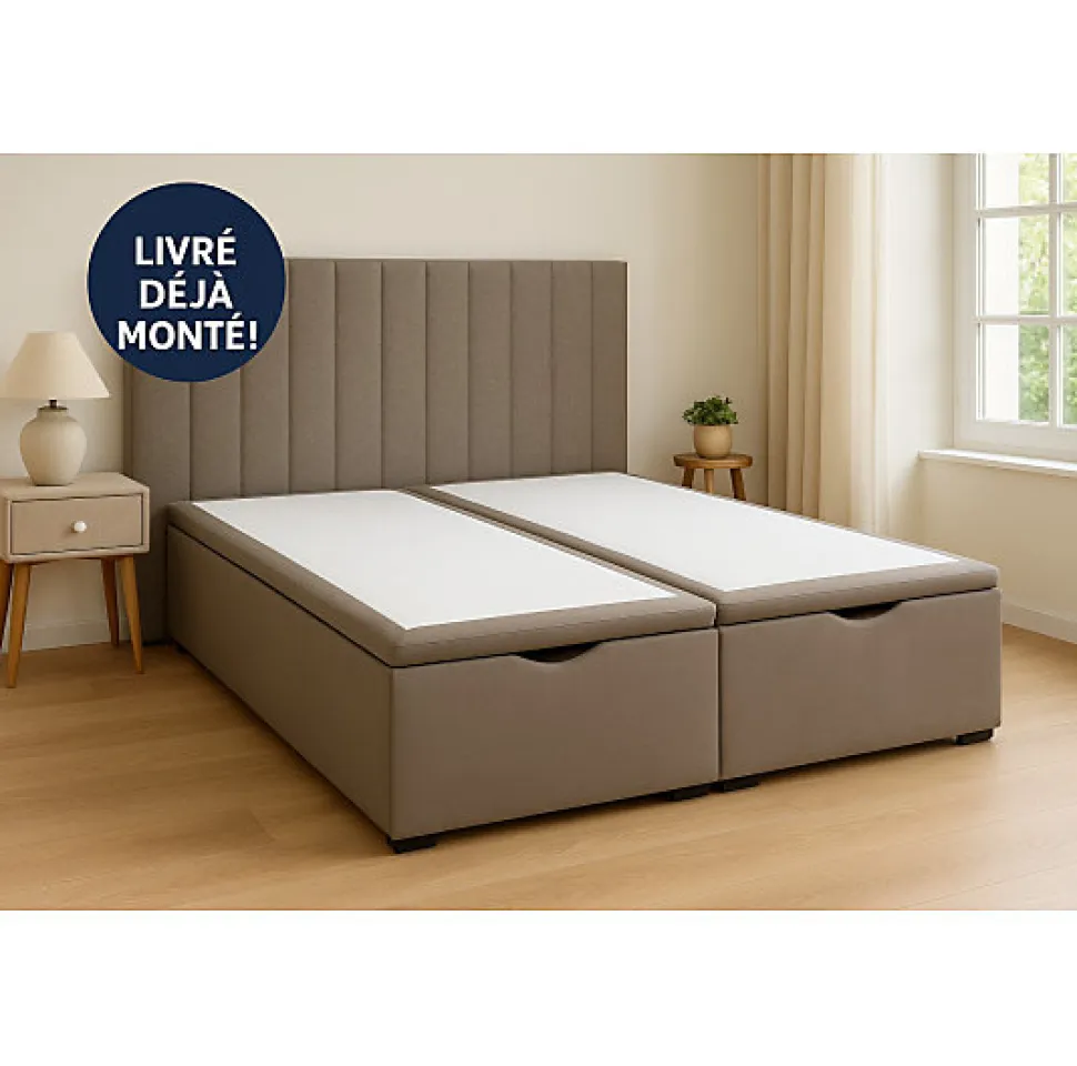 Lit Coffre IRIS : Confort Actif & Rangement XXLLe sommier Coffre Iris est la solution idéale pour ceux qui recherchent un sommeil réparateur sans compromis sur l’espace et l’esthétique. Ce sommier haut de gamme, conçu pour allier confort, fonctionnalité et style, vous offre un soutien dynamique et une capacité de rangement inégalée. LES POINTS FORTS DU SOMMIER COFFRE HERITAGEDesign Intégré & Élégant : Un sommier qui vous ressemble et qui s’adapte à votre chambre avec un large choix de couleurs. Soutien Actif & Confortable : Le sommier est équipé de 2 x 20 lattes actives (multi-plis) extra larges, offrant un soutien dynamique de qualité et une aération optimale du matelas.Rangement XXL : Profitez d’une très grande capacité de stockage grâce au coffre profond (caisse de 29 cm), idéal pour libérer l’espace dans vos armoires. DÉTAILS TECHNIQUES & TECHNOLOGIES :Hauteur totale : 38 cmLattes actives (multi-plis)Livré en deux partiesAssemblage des deux plateaux avec plaquettes métalliquesLivré sans la tête de lit, tête de lit en option : tête de lit ZOLYA, tête de Lit SELINE Vous pourrez également mettre la tete de lit Tonya1. Des Nuits de Qualité et un Soutien ParfaitSoutien Dynamique : Le sommier intègre 2 x 20 lattes actives ext