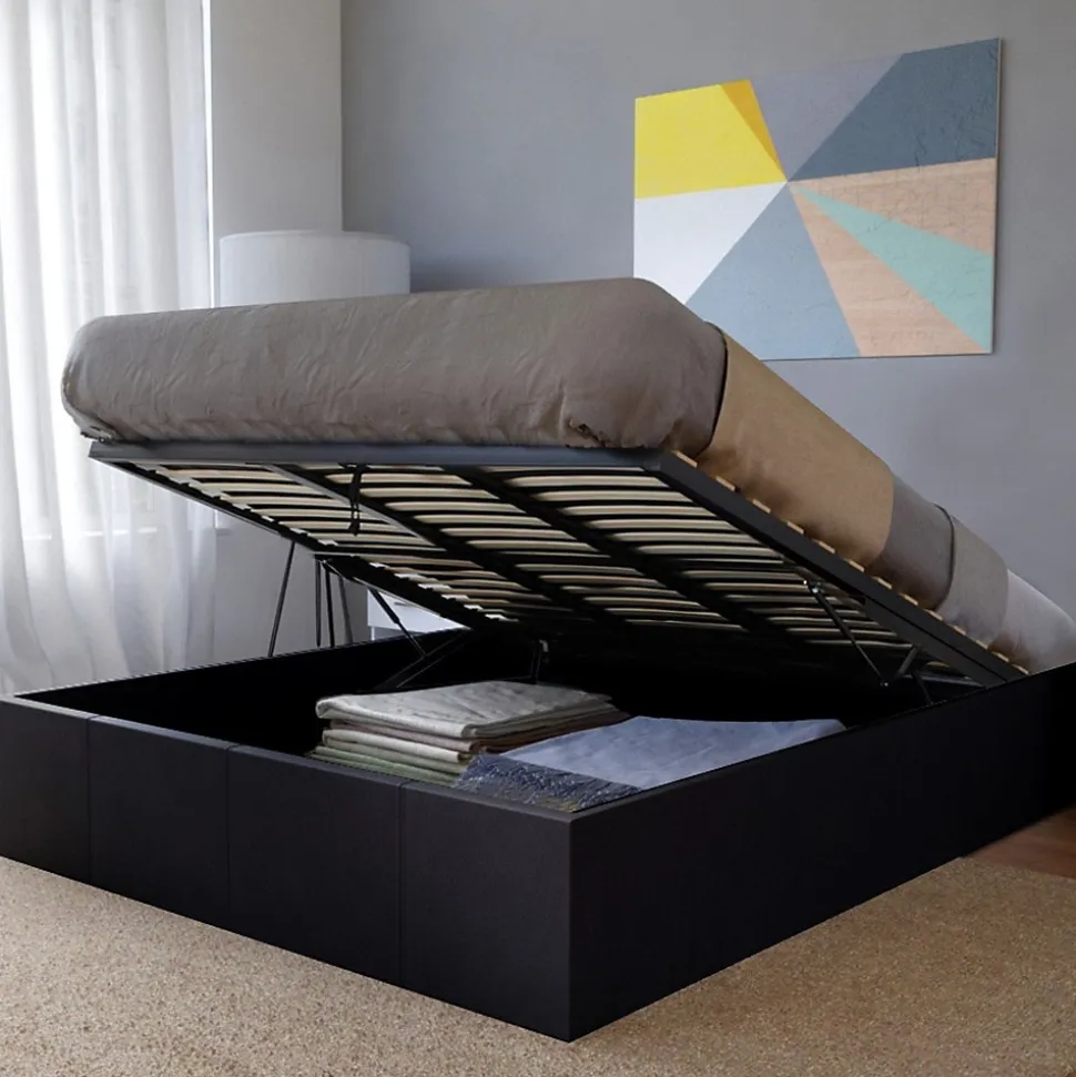 - Lit coffre double TORINO 160 x 200 cmLe lit coffre TORINO est le lit idéal pour les petits espaces. Son design sobre et intemporel lui permet de s’adapter à tous les types d’intérieur. L’atout majeur du lit TORINO est son coffre dissimulé sous le matelas : un rangement supplémentaire spacieux pour stocker toutes vos affaires.Caractéristiques :Structure métallique, revêtement cuir PU (polyuréthane), couleur noireSommier 15 lattes en bois, section 52×8 mmLivré démonté, à monter soi-même, livré sans matelas ni éléments de décorationDimensions:210x175x32