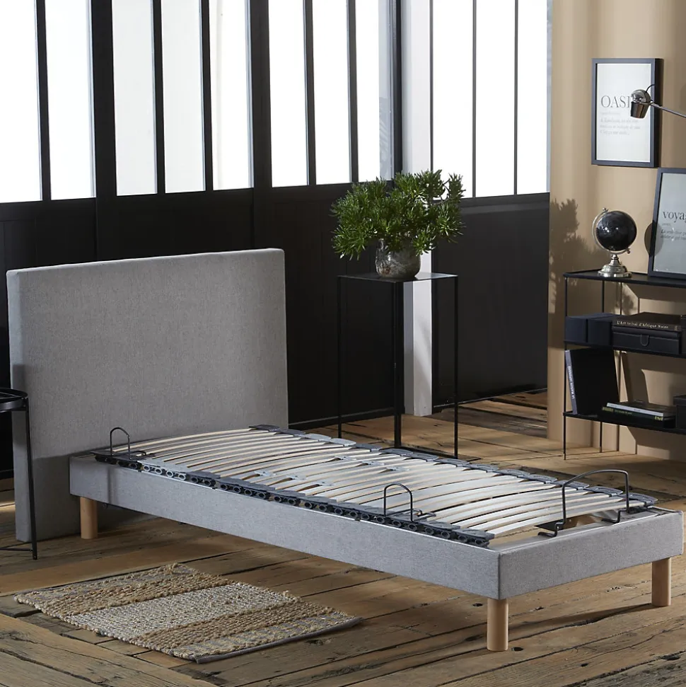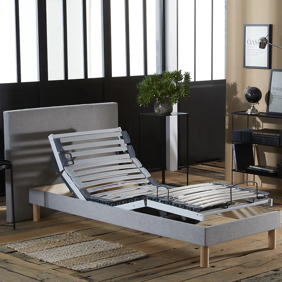 Ensemble lit électrique multi-lattes + matelas mémoire de forme Profitez du confort d’un ensemble de relaxation motorisé composé d’un sommier à lattes multiplis habillé d’un tissu et d’un matelas en mousse à mémoire de forme conçu pour un sommeil profond et réparateur. Matelas mousse à mémoire de forme Le matelas à mémoire de forme épouse les coeurbes du corps pour un soutien morphologique précis. Il réduit les points de pression, soulage les zones sensibles et améliore la circulation sanguine. Parfaitement compatible avec les sommiers de relaxation, il offre une sensation enveloppante et un excellent maintien. Structure solide et élégante Le sommier repose sur une caisse en bois de 16 cm recouverte d’un tissu beige. Sa hauteur totale atteint 31 cm une fois les pieds montés. Maintien optimal avec lattes multiplis Ce sommier est équipé de 29 lattes multiplis avec embouts de suspension, garantissant un bon maintien du dos et une indépendance de couchage. 6 lattes sont dotées de curseurs de fermeté pour ajuster le confort en zone lombaire. Moteur puissant et sécurisé Le moteur 6000 Newton assure des mouvements rapides. En cas de coupure de coeurant, un relai 9V remet automatiquement le sommier en position couchage. Garantie moteur : 2 ans. Télécommande sans fil intuitive La télécommande sans fil est équipée de 7 boutons rétroéclairés et d’une lampe torche intégrée pour une utilisation simple, même dans l’obscurité. Accessoires inclus Pieds : 4 pieds cylindriques en bois finition hêtre vernis, hauteur 15 cm, filetage 8 mm. Barres d’arrêt : 1 butée au pied et 2 barres latérales pour maintenir le matelas. Informations complémentaires Le sommier est préassemblé en usine, seuls les pieds