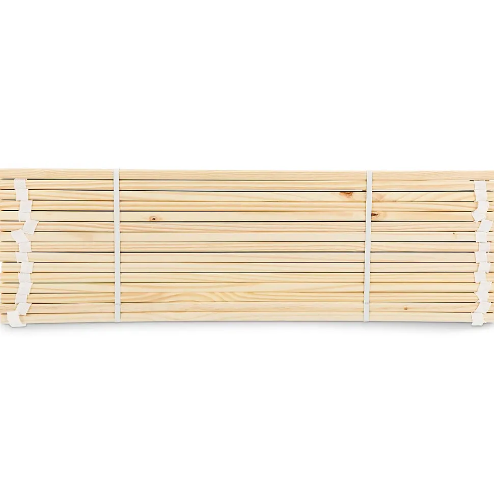 Le sommier sans cadre en pin massif … est constitué de 15 lattes accrochées les unes aux autres par des bandes de tissu. Facile à installer, le sommier se fixe en vissant les lattes pré-percées sur les tasseaux de votre cadre de lit, à l’aide du kit de visserie inclus. Associé au matelas correspondant à la taille de couchage de votre lit, ce sommier vous assurera un confort optimal. Fabriqué en pin massif, il offre également une résistance supplémentaire pour une longévité remarquable. Description des matériaux : – Le sommier est fabriqué en pin massif avec une finition bois brut. Caractéristiques du produit : – Epaisseur des lattes : 15 mm – Largeur des lattes : 7 cm – Espacement entre les lattes : 6,8 cm – Convient pour un couchage 100×200 cm – Les lattes sont pré-percées (diamètre : 4 mm), kit de visserie inclus avec 30 vis Livraison et montage : – Contenu de la livraison : sommier sans cadre avec 15 lattes, kit de visserie inclus – Le produit est livré enroulé – Vendu sans cadre – Photo non contractuelle Résumé: – Sommier: inclus – Dimensions monté: 2 x 100 x 196 cm (H x L x L) – Couchage: 100 x 200 cm – Couleur: Naturel – Matériel: Pin massif