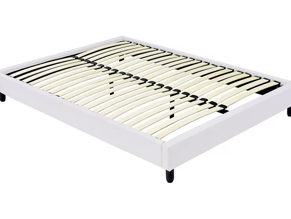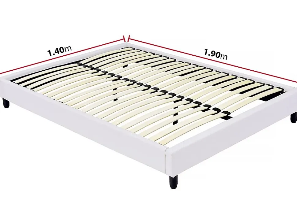 Sommier tapisser à lattes 140 x 190 cm Ce sommier est équipé de 12 lattes souples en bois. Celles-ci vous permettront de soutenir efficacement votre matelas pour vous offrir une literie agréable et confortable. Fabriquées en contreplaqué, ces lattes sont résistantes et appréciées pour leur fiabilité dans le temps.Un sommier tapissierEn plus d’être pratique, ce sommier dispose également d’un design soigné. Sa structure en bois est enveloppé dans un tissu en polyester, mis en valeur par un garnissage en mousse discret. Tout son design est pensé pour se fondre lement dans votre chambre à coucher. À la fois chic et discret, le style de ce sommier vous permet de l’assortir librement et sans contrainte à la décoration de votre chambre.Une meilleure propretéParce qu’il est partiellement tapissé, ce sommier a pour avantage de permettre à votre literie de respirer. Autant pour votre matelas que pour le sommier à lattes, cette aération va permettre le renouvellement de l’air à l’intérieur de votre ensemble literie, réduire les mauvaises odeurs ainsi que le développement de bactéries. Enfin, cette ouverture vous donnera la possibilité d’entretenir et de vérifier régulièrement l’état de vos lattes. Sommier tapissier – Dimensions matelas : 140 x 190 cm – 2 x 12 lattes – Structure en contreplaqué – Cadre recouvert de polyester – Pieds fournis – Blanc .Descriptif du sommier: Sommier tapissier pour matelas 140 x 190 cm – Structure en bois – Revêtement tissu – 2 x 12 lattes en bois – Supporte jusqu’à 200 kg – Pieds fournisCouleurs: blancDimensions du couchage: 140 x 190 cmDimensions: 150 x 214 x 27 cmCoutil / finition: Revêtement en polyesterGarnissage: En mousseMatières: TissuStructure: ContreplaquéCaractéristiques produit: Lattes : 70.8 x 5.3 cm – Épaisseur : 9 mm – Qté.: 2 x 12 – En contreplaquéTaille: 140 x 190 cmpieds: Founispieds: 5 x 5 x 10 cmColisage: 2 colis : – 2 x 0,24 x 0,21 m, 15,15 kg – 1,56 x 0,47 x 0,105 m, 11,35 kg