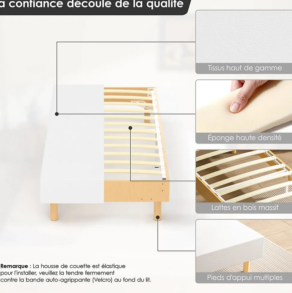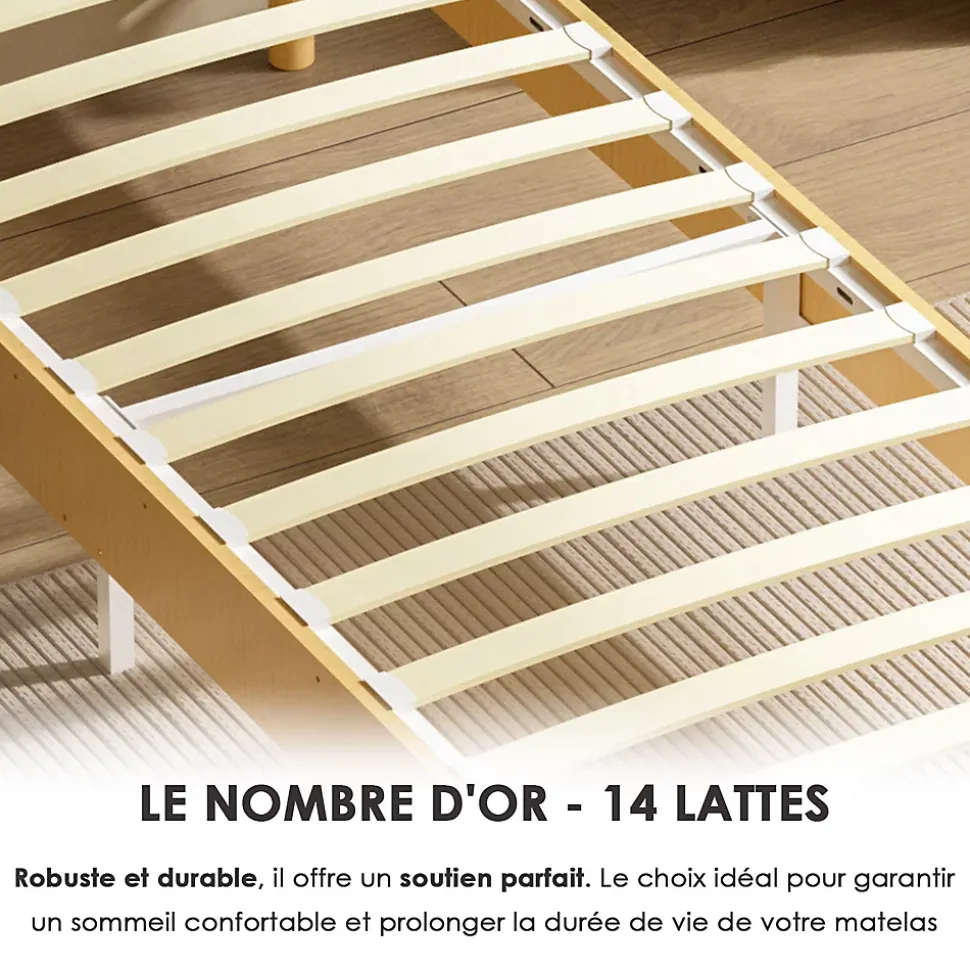 Couleur : BlancMatériau : Bois + Peuplier + MétalAssemblage requis : OuiTête de lit incluse : NonDimensions : 80 x 200 cmHauteur intérieure des pieds : 15 cmHauteur totale du lit : 29 cmHauteur entre le sol et le cadre du lit : 29 cmHauteur du rangement sous le lit : 15 cmNombre de pieds : 6Dimensions de l’emballage : 103,5 x 27 x 19 cmPoids de l’emballage : 20 kg