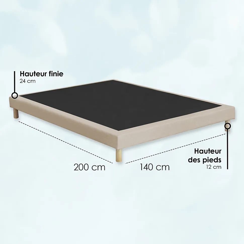 idliterie – Sommier tapissier 140×200 cmCe sommier tapissier de la marque idliterie est idéal pour un couchage double de 140×200 cm. Avec sa technologie de lattes passives, il offre un soutien raffermit pour un confort optimal. Ce sommier coffre tapissier à lattes est rembourré et sa structure en bois massif garantit une grande robustesse. Les pieds sont fournis pour une installation facile.Caractéristiques :- Type de produit : sommier tapissier- Surface du matelas : 140×200 cm- Nombre de personnes : 2- Type de soutien : raffermit- Type de sommier : sommier tapissier- Type de facette : sommier coffre tapissier à lattes- Technologie du sommier : lattes passives- Taille du lit : double- Rembourré- Matière de la structure : bois massif- Longueur du couchage : 200 cm- Largeur du couchage : 140 cm- Épaisseur du lit : 11 cm- Électrique : non électrique- Compatibilité avec tout type de matelas- Compatibilité avec sommier 2 personnes- Couleur : beige- Avec rangement : sans rangement- Pieds inclus