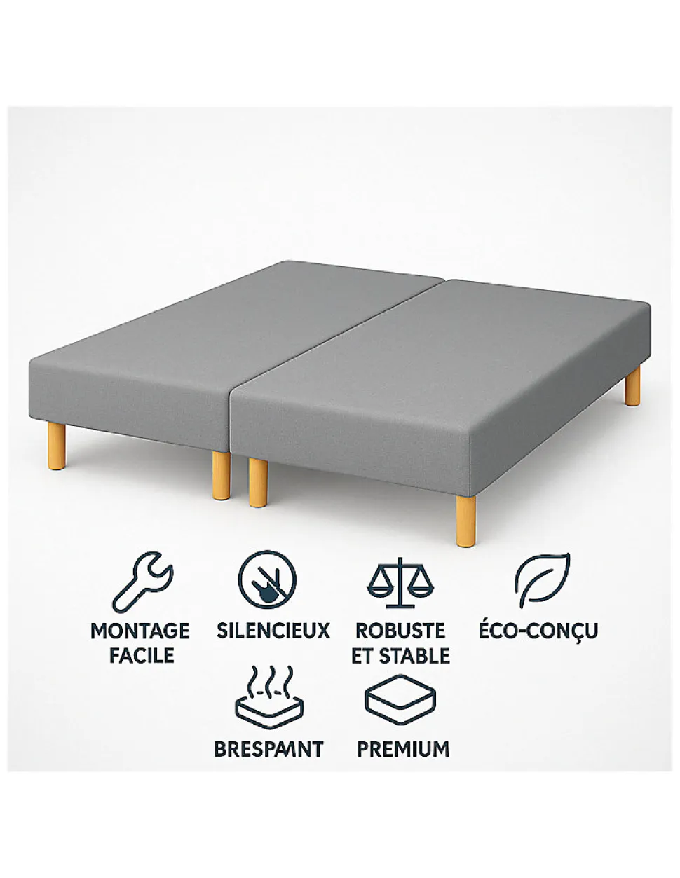 SOMMIER TAPISSIER GRIS 100x200x2 (200x200) FABRICATION FRANÇAISE ARTISANALE PIEDS OFFERTS HAUTEUR avec PIEDS 27 cm
