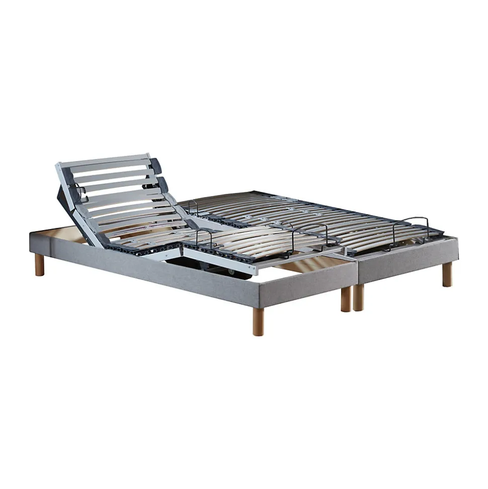 Lot de 2 lits électriques de relaxation à lattes ? finition tissu matelassé gris Profitez d’un confort sur mesure avec ce lot de 2 sommiers de relaxation motorisés, habillés d’un tissu gris élégant. Grâce à leurs 5 plans de couchage indépendants, chaque sommier s’adapte parfaitement à vos besoins de confort et de récupération. Structure solide et finition soignée Chaque sommier repose sur une caisse en bois de 16 cm recouverte d’un tissu gris, pour une hauteur totale de 31 cm une fois les pieds montés. La Structure allie robustesse et esthétique contemporaine. Confort réglable avec lattes multiplis Chaque sommier intègre 29 lattes multiplis avec embouts de suspension, assurant un maintien du dos précis et une bonne indépendance de couchage. 6 lattes sont équipées de curseurs de fermeté pour ajuster la zone lombaire selon vos préférences. Motorisation performante et sécurisée Les sommiers sont équipés d’un moteur 6000 Newton pour des mouvements fluides et puissants. En cas de coupure de coeurant, un relai par pile 9V remet automatiquement le sommier à plat. Garantie moteur : 2 ans. Télécommande sans fil intuitive Chaque sommier est livré avec une télécommande sans fil comportant 7 boutons rétroéclairés et une lampe torche intégrée, pour une utilisation simple, même dans l’obscurité. Accessoires inclus Pieds : 4 pieds cylindriques en bois finition hêtre vernis par sommier, hauteur 15 cm, filetage 8 mm. Barres d’arrêt : 1 butée au pied et 2 barres latérales par sommier. Informations complémentaires Les sommiers sont préassemblés en usine, seuls les pieds sont à visser. Matelas non fournis. Tête de lit non fourniGarantie 5 ans.