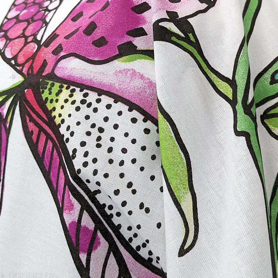 - Parure de lit 100% coton avec imprimé de fleurs colorées hautes en couleur rose, vert, bleu et gris sur fond blanc.