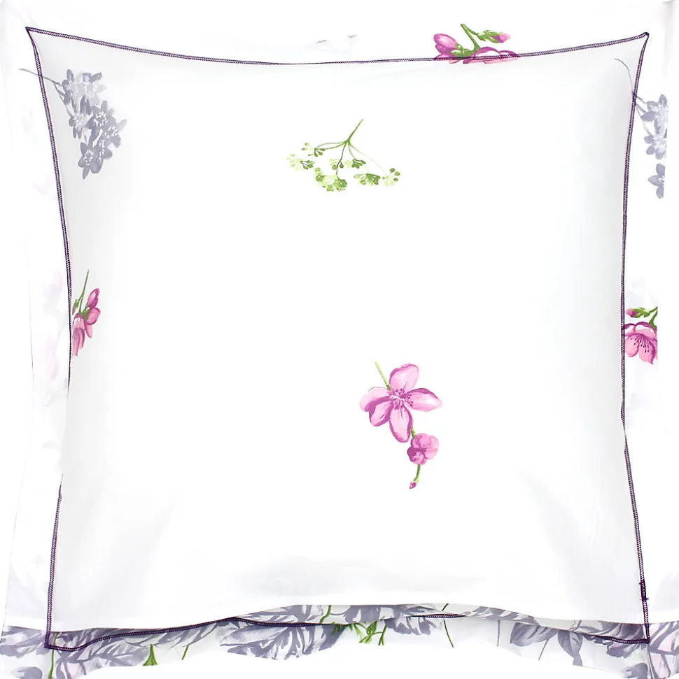Taie d’oreiller carrée 65×65 cm 100% coton 57 fils/cm² – PRETTY Parure de lit 100% coton avec des motifs de grandes fleurs dans des nuances de rose, violet et vert sur fond blanc.
