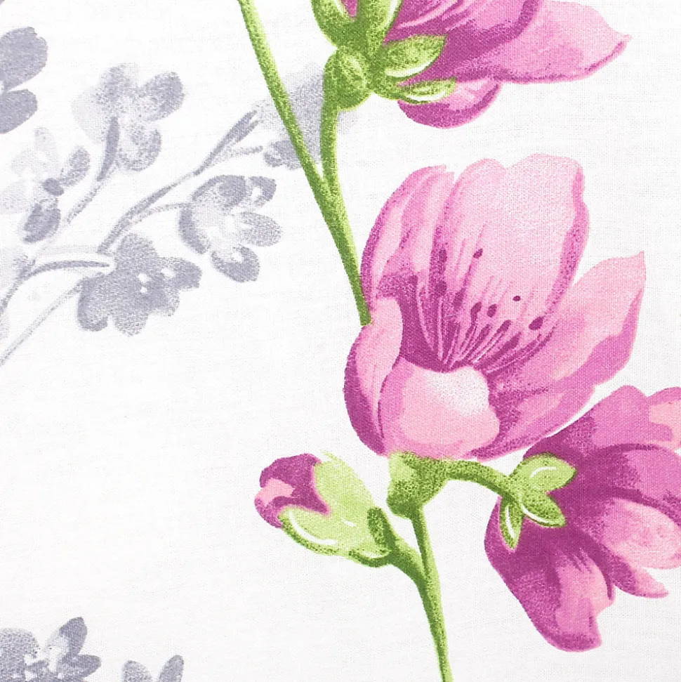 - Taie d’oreiller carrée 65×65 cm 100% coton 57 fils/cm² – PRETTY Parure de lit 100% coton avec des motifs de grandes fleurs dans des nuances de rose, violet et vert sur fond blanc.