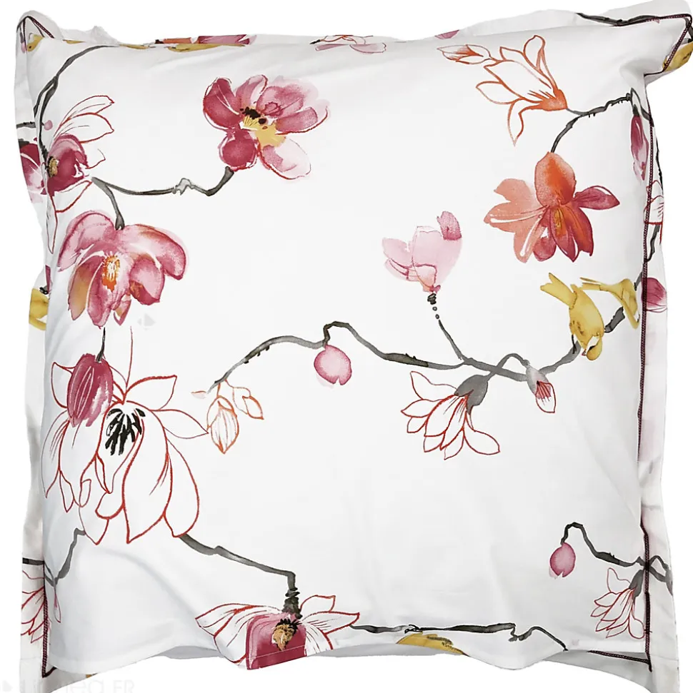 - Taie d’oreiller carrée 65×65 cm Percale 80 fils/cm² ELISA Parure de lit percale de coton avec un imprimé de végétation sur branche composée de feuillages et fleurs de magnolias, dans des tons pastels de jaune, rose sur fond blanc.