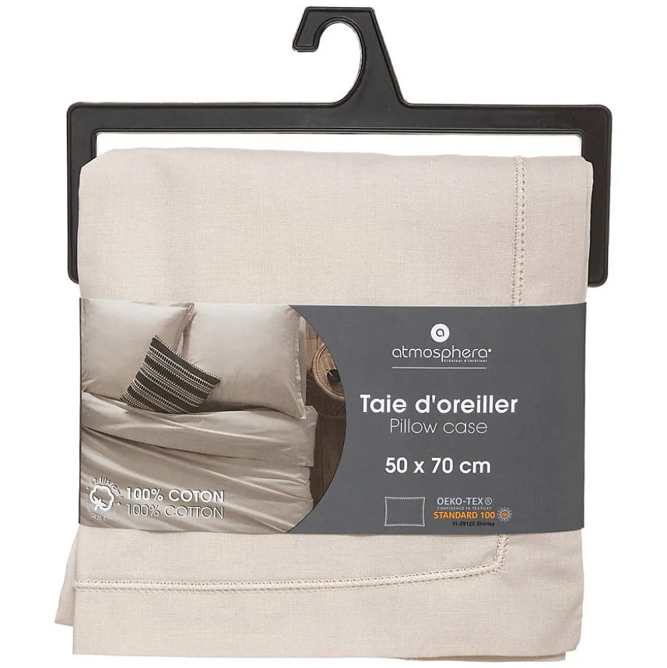Complétez votre parure de lit avec la taie d’oreiller en coton Atmosphera.Classique et sobreLa taie d’oreiller Atmosphera est sobre et élégante avec sa finition point bourdon ton sur ton et son volant plat. En coton, elle passe en machine à 60 degrés.Optez pour un drap-housse et une housse de couette Atmosphera du même coloris pour composer votre parure de lit.Le petit plus décoPour ajouter confort et originalité à votre chambre à coucher, multipliez les oreillers et jouer sur différentes teintes du même coloris pour créer une harmonie.Produit labellisé OEKO-TEX