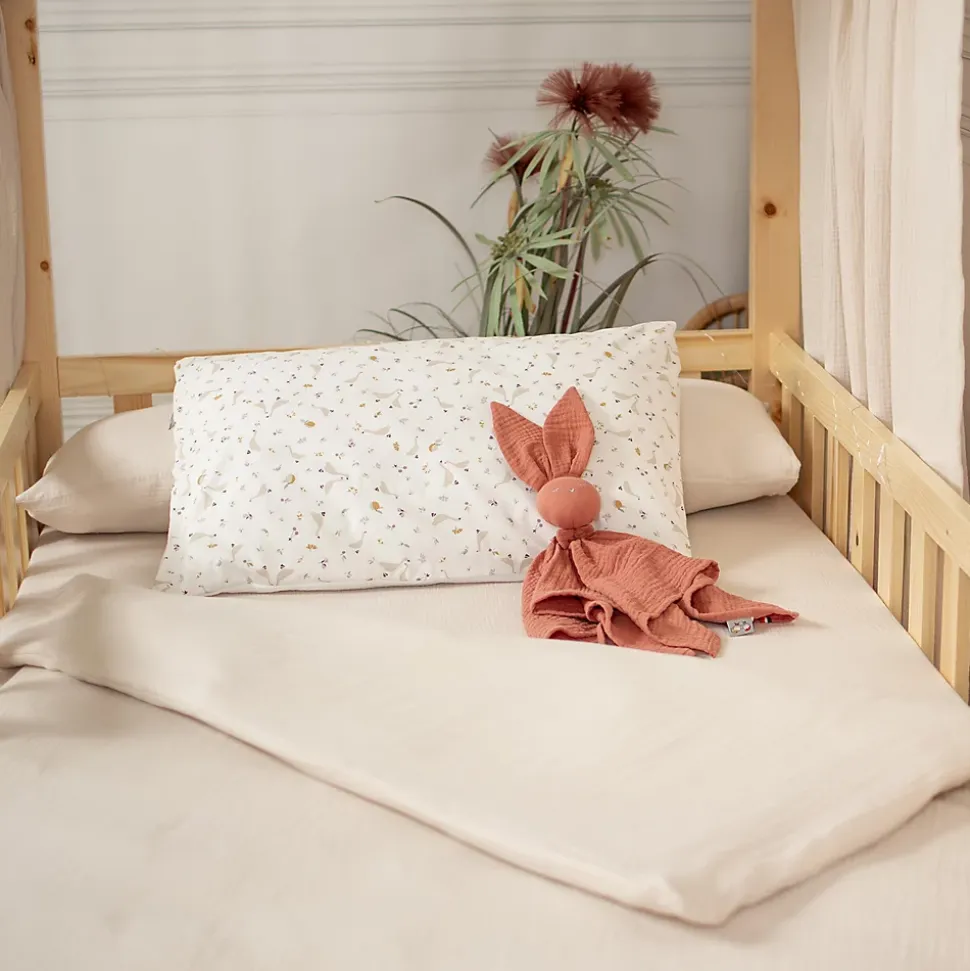 Taie d’oreiller réversible Sidonia en coton imprimé et gaze de coton – Made in France !Complétez la chambre de votre enfant avec notre taie d’oreiller Sidonia, une pièce douce et confortable en coton de haute qualité, avec une face en gaze de coton unie blanche et l’autre en coton imprimé. Ses motifs délicats d’oies, de baies et de fleurs à l’esprit minimaliste apportent une touche d’élégance à l’univers de votre tout-petit, tout en garantissant un sommeil paisible et confortable. Parfait pour s’harmoniser avec la housse de couette Sidonia.Cette taie d’oreiller réversible est confectionnée en France avec des matières certifiées, garantissant un environnement sain et pour la peau délicate des enfants. La gaze de coton, légère et respirante, absorbe l’excès d’humidité, tout en étant hypoallergénique et antibactérienne.Idéale pour offrir à votre enfant un sommeil réparateur, cette taie d’oreiller s’adapte parfaitement aux saisons grâce à sa face en coton imprimé et sa face en gaze de coton unie blanche. Ce tissu double face permet de changer facilement l’ambiance de la chambre, alliant douceur, confort et esthétisme.Caractéristiques de la taie d’oreiller Sidonia :Design réversible : Une face en coton imprimé avec des motifs d’oies, baies et fleurs, et l’autre en gaze de coton unie blanche pour un look minimaliste et élégant.Matières de haute qualité : Confectionnée en 100% coton certifié, garantissant douceur et sécurité pour les peaux sensibles.Fabrication française : Produit fabriqué dans nos ateliers en France, soutenant le savoir-faire local et réduisant l’empreinte carbone