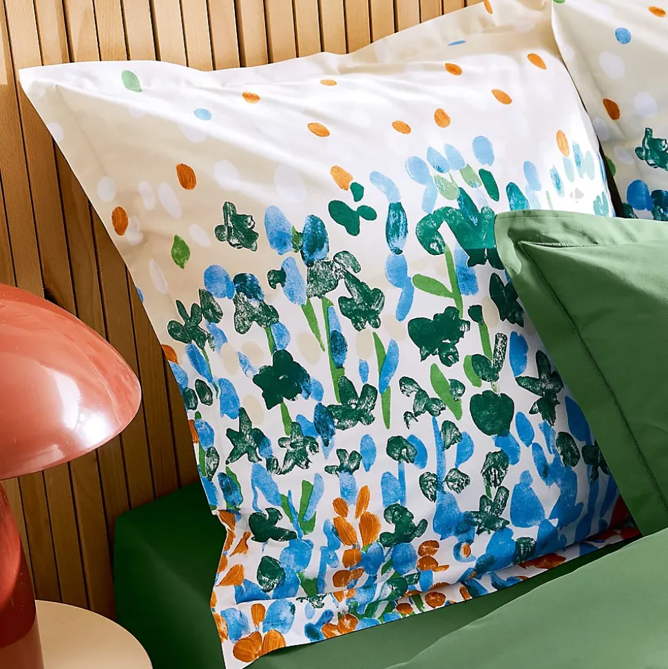 - Taie d’oreiller 65×65 cm EVASION Vert fougère 100% coton avec des motifs de végétation vert, bleu et corail