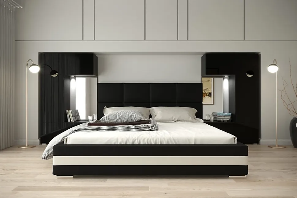 L’ensemble comprend : 2 armoires de rangement design attenants au lit Dimensions : – Largeur : 345-385 cm – Hauteur : 159 cm – Profondeur : 35 cm Toutes les dimensions détaillées dans les images du produit Matériaux: – Structure en panneau de particules – Façades en MDF, feuille de finition brillant NON LAQUÉE Coloris : noir mat et noir brillant * Ensemble vendu sans lit * Les lumières LED ne sont pas incluses