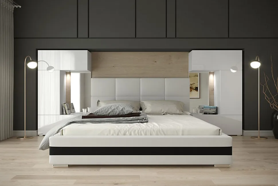 L’ensemble comprend : 2 armoires de rangement design attenants au lit Dimensions : – Largeur : 345-385 cm – Hauteur : 159 cm – Profondeur : 35 cm Toutes les dimensions détaillées dans les images du produit Matériaux: – Structure en panneau de particules – Façades en MDF, feuille de finition brillant Coloris : blanc mat et blanc brillant * Ensemble vendu sans lit * Les lumières LED ne sont pas incluses