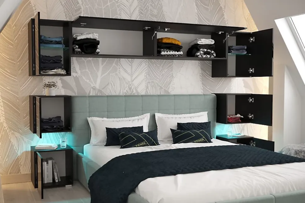 L’ensemble comprend : composition de 8 armoires de rangement Dimensions : – Largeur : 256 cm – Hauteur : 182 cm – Profondeur : 35 cm Toutes les dimensions détaillées dans les images du produit Matériaux: – Structure en panneau de particules – Façades en MDF, feuille de finition brillant NON LAQUÉE Couleur : noir et noir brillant * Ensemble vendu sans lit * Les lumières LED ne sont pas incluses